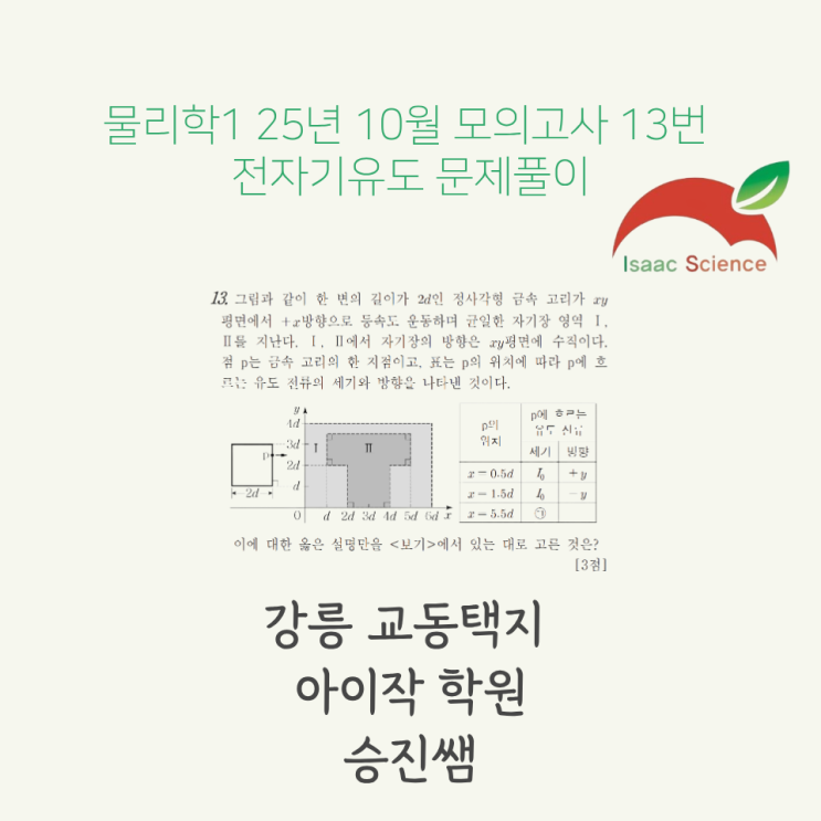 안녕하세요 강릉 교동택지 아이작 학원 승진쌤입니다 :) 이번 영상에서는 25년 10월 모의고사 물리학1 13번 전자기 유도 문제를 풀어보겠습니다. 자세한 풀이는 영상을 참고해주세요. https://youtu.be/4BJx7nJBVGU <img src="https://blogthumb.pstatic.net/MjAyNjAyMDdfMyAg/MDAxNzcwNDU2ODY4NTUz.drUzVWLs-gWc6cnThJnbjwshvMUlqBwJhapEYCSCCqcg.kGRr-UNjOyqvSY9tKyiFwrK8rD9B05a8mH7i_ewJif8g.PNG/%C1%A6%B8%F1%C0%BB_%C0%D4%B7%C2%C7%D8%C1%D6%BC%BC%BF%E4._%281%29.png?type=s3" />
