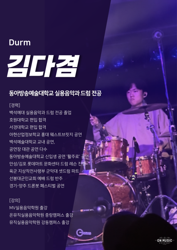 안녕하세요 온뮤직 실용음악학원 중랑캠퍼스 입니다^^ 오늘은 온뮤직 중랑캠에 새로 출강하시게 된 드럼 선생님, '김다겸 선생님'을 소개하려고 합니다~! 김다겸 선생님 경력 및 활동 동아방송예술대학교 실용음악과 드럼 전공 백석예대 실용음악과 드럼 전공 졸업 호원대학교 편입 합격 서경대학교 편입 합격 아현산업정보학교 홍대 웨스트브릿지 공연 백석예술대학교 교내 공연, 공연장 대관 공연 다수 동아방송예술대학교 신입생 공연 '활주로' 공연 안성/김포 롯데마트 문화센터 드럼 레슨 진행 육군 지상작전사령부 군악대 셋드럼 파트 선봉대군인교회 예배 드럼 반주 경기-양주 드론봇 페스티벌 공연 강의 MV실용음악....... <img src="https://blogthumb.pstatic.net/MjAyNjAyMDZfMTcz/MDAxNzcwMzc0MTk1ODc2.caW-yLNafc90sfcNHKEZjuyZVPkPWtA_cJDYxTDoxlMg.HPK1WzfBdcZwUFIi-PaEHflV0mW6gJqp3lTKcAaD9_cg.PNG/%B1%E8%B4%D9%B0%E2_%BC%B1%BB%FD%B4%D4_%C7%C1%B7%CE%C7%CA.png?type=s3" />