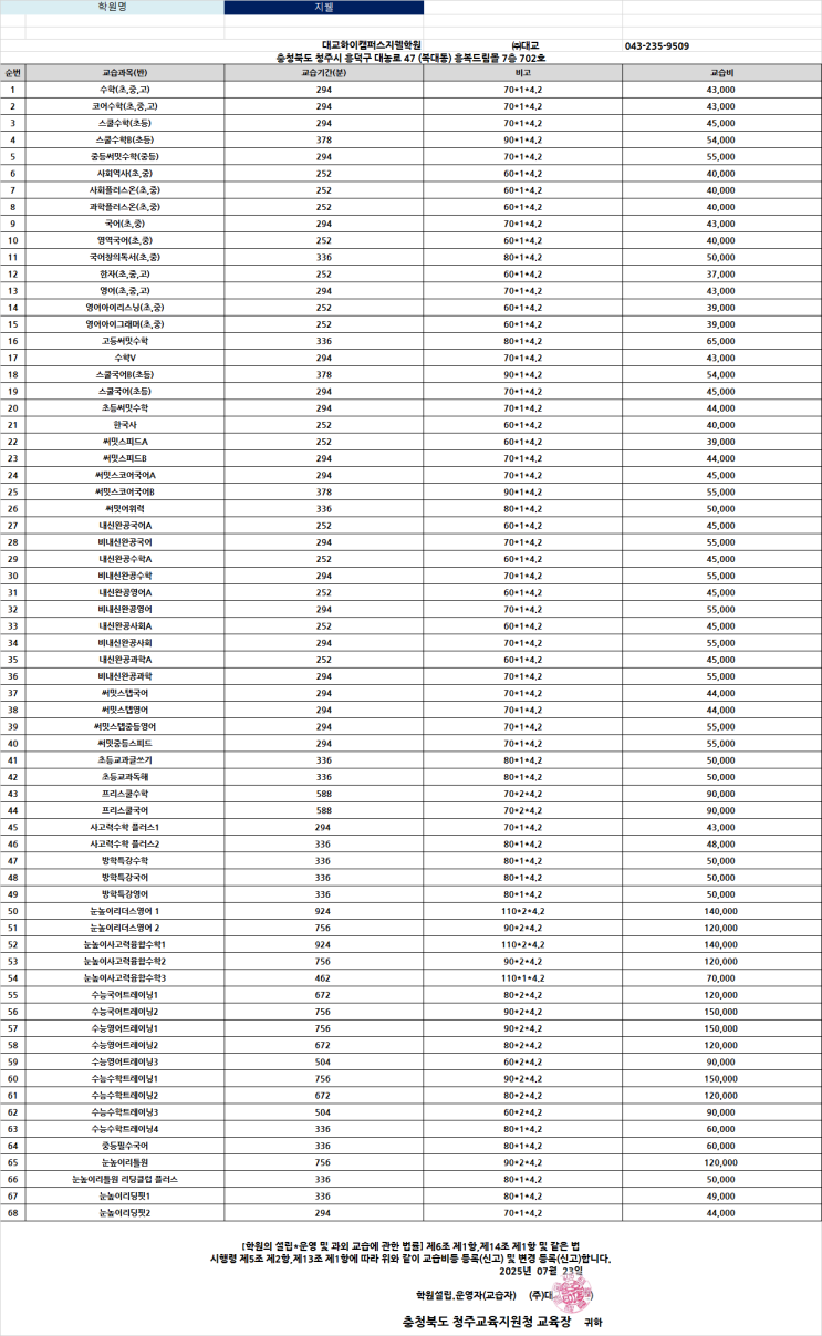 눈높이러닝센터 하복대학원 제품별 회비