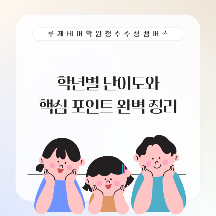 안녕하세요, 대성여중영어학원 루체테어학원청주주성캠퍼스입니다. 중등영어는 학년이 올라갈수록 문법과 어휘, 독해의 난이도가 점차 복합적으로 변하는 시기입니다. 많은 학부모님께서 아이의 학년별 난이도와 효율적인 학습 포인트를 궁금해하시며 문의하십니다. 저희는 이 시기 학생들에게 체계적인 학년별 학습 전략과 핵심 포인트를 정확히 안내하며 영어 실력을 안정적으로 쌓을 수 있도록 도와드리고 있습니다. 중1의 영어 학습은 기본 문법과 어휘를 중심으로 듣기와 읽기 능력을 함께 확장하는 시기입니다. 문장을 구조적으로 이해하고 주어진 표현을 문맥 속에서 활용할 수 있는 능력이 중요합니다. 또한 독해의 기초를 다지며 질문에....... <img src="https://blogthumb.pstatic.net/MjAyNTEyMzFfMjU2/MDAxNzY3MTQ5MDU2NjE5.mWcixqXAtmddSRZhnD3N7dHNckqCeeh28vRXcdWnfkIg.dollnP317OBikrN1U97f3lOMEzJnCpOfMUZchdqYA9sg.PNG/%C1%A6%B8%F1%C0%BB_%C0%D4%B7%C2%C7%D8%C1%D6%BC%BC%BF%E4._%289%29.png?type=s3" />