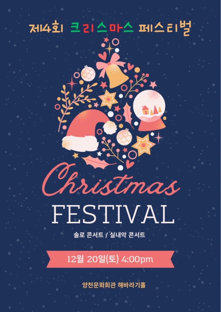 안녕하세요.리나바이올린의 가장 큰 행사인 ”제4회 크리스마스 콘서트“를 양천문화회관 해바라기홀에서 개최합니다.(2025.12.20.토)각자의 개성이 담긴 솔로 무대와 함께 호흡하며 서로의 소리에 귀 기울이는 앙상블 무대로 채워질 예정입니다.작년에 비해 올해는 곡 수준도 많이 올라가고 앙상블도 다양한곡으로 준비하고 있어서 더 감동적이고 즐거운 무대가 될 것 같습니다. *1부-솔로 콘서트 *2부-실내악콘서트(키즈 앙상블/유스앙상블/가족 앙상블/합주) <img src="https://blogthumb.pstatic.net/MjAyNTEyMDdfMTI1/MDAxNzY1MDc0OTc3NjU0._jd5W-FPxWFVP3GgUiTfLKf7fC8jUepmQdSjUzVPYh4g.e_B79_rZNzgLxvoT26dtAQbOzpeE-0k0pGTzL7AWy5wg.JPEG/900%A3%DFBandPhoto%A3%DF2025%A3%DF12%A3%DF07%A3%DF11%A3%DF35%A3%DF32.jpg?type=s3" />