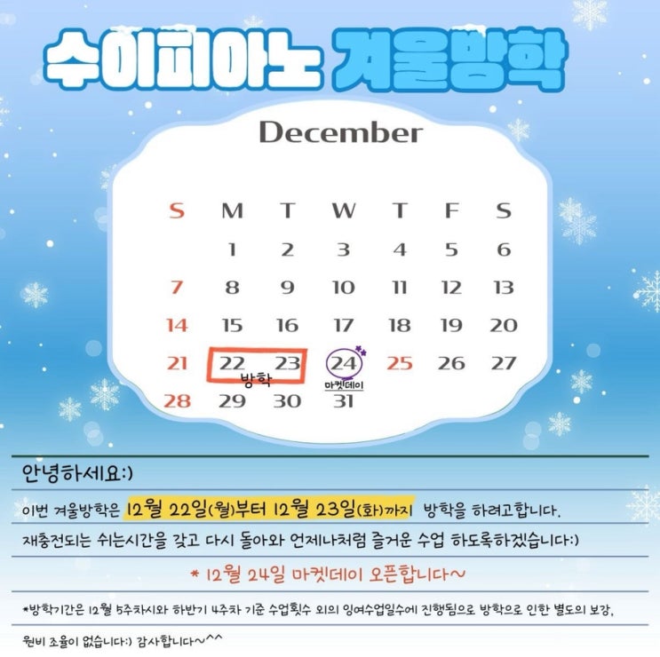 으..아니…?! 가을 피드 올린지 얼마안됬는데 벌써!! 12월 마지막주를 향해 가네용..!! 요즘 열레슨하느라 SNS할 체력 없는 요즘 입니다…ㅎㅎ 방학기간동안 밀린 업무와ㅎㅎㅎ 크리스마스 영상 배송을 위해 기기를 붙잡아 보려합니다 마켓데이는 … 아직 덜 준비된 상태.. 뽜이아~!!! 열일하고~ 푹 충전되는 시간 갖고 복귀하겠습니다용~~!! ❤️❤️❤️❤️❤️❤️ 12/22-23 방학 ❤️❤️❤️ <img src="https://blogthumb.pstatic.net/MjAyNTEyMjBfMzkg/MDAxNzY2MjMwNzE3NzMx._W118VY6M7wTwMBkDltG7crSf0__8c6nkR48qUktb9gg.m_pcUdcK0kHHVt8G5lN3rvAl8LVozCRyGs576mtsf3Mg.JPEG/IMG%A3%DF2595.jpg?type=s3" />