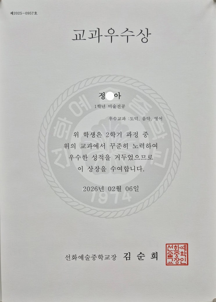 2025년 2학기에도 우리 대치예뜨락 미술학원 학생들이 학업에서도 우수한 성적을 받았습니다!! 정O아 학생의 교과우수상 수상을 축하합니다~~ <img src="https://blogthumb.pstatic.net/MjAyNjA0MDFfMTQ4/MDAxNzc1MDQyMjMwODM5.SMiACW-nUmuRU8s3JxZ0PMXzzeOlH7InM3wGvOtVcj0g.QGJNPig97LlLPvgSzt6JDjo0asa_sPjnG7eRlJj-2QUg.JPEG/KakaoTalk_20260208_102202635_06.jpg?type=s3" />