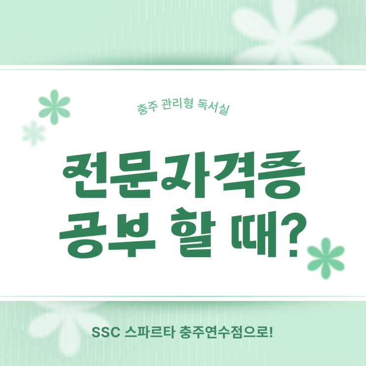 안녕하세요. SSC 스파르타 충주연수점입니다 점심을 먹고 독서실 주변을 산책하다보면 봄이 왔다고 소식을 알려주는 목련, 벚꽃들을 만날 수 있습니다. 공부하다 지칠 때, 맛있는 식사 후 산책할 때 주변을 둘러보며 보물 찾기하듯 봄의 선물을 찾으며 기분 전환이 되면 좋겠습니다. 취업을 위한 전문 자격증 준비, 방향이 맞는지 불안할 때? 취업을 준비하기위해 전문자격증을 공부하다 보면 이런 고민을 한 번쯤 하게 됩니다. “이 방향이 맞는 걸까?” “계획은 세웠는데 왜 계속 무너지지?” 혼자 공부를 이어가는 건 생각보다 쉽지 않습니다. 그래서 SSC스파르타는 단순한 공부 공간이 아니라 합격까지 이어지는 구조를 만들었습니다. ....... <img src="https://blogthumb.pstatic.net/MjAyNjAzMzBfNzIg/MDAxNzc0ODU0NzkxMzQy.a01oDn5Gx4LZ32ad5FXXz5-aRODYBijdWqOU17E11J4g.dsojFyOGNStUTm-QX48xmuDe10FjvigzpndxDCCsmR0g.PNG/1.png?type=s3" />