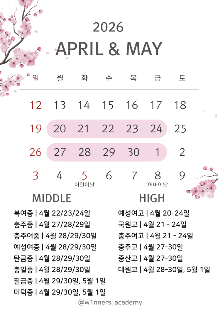 안녕하세요 ! 충주위너스학원입니다. 이제 점점 2026년의 첫번째 시험인, 1학기 중간고사가 다가오고 있습니다 ! 그래서인지 학원 내에서도 쉬는시간에 학생들의 대화를 들어보면 시험에 관한 이야기가 많더라구요. 점수 내기를 하자던지, 끝나고 뭐하고 놀 건지, 이 과목은 다 맞겠다부터 이건 포기하겠다까지... 그러면서 자연스레 수업 때 질문도 많아지고, 더 잘해보려는 모습들이 눈에 계속 보이기에, 함께 더욱 열심인 4월이 될 것 같습니다 그래서 시험 디데이를 각인시키고자(?) 로비에 시험 일정 캘린더를 하나 더 붙여봤습니다 집 앞 주차장에도 벚꽃이 거의 다 피었기에, 캘린더에도 벚꽃을 피워봤으요. 처음 또는 이....... <img src="https://blogthumb.pstatic.net/MjAyNjA0MDJfMTEz/MDAxNzc1MTI4MzQ4NjM2.PIKCN-oVyy2JAEWUChq_XDZGFrYz-P_SpMN47vyyMZ8g.2BRppnRHcYOu5STc1uKW8wqhRW3Sds0sZ38cgb_ne0sg.PNG/%BD%BA%C5%A9%B8%B0%BC%A6_2026-04-02_20.12.24.png?type=s3" />