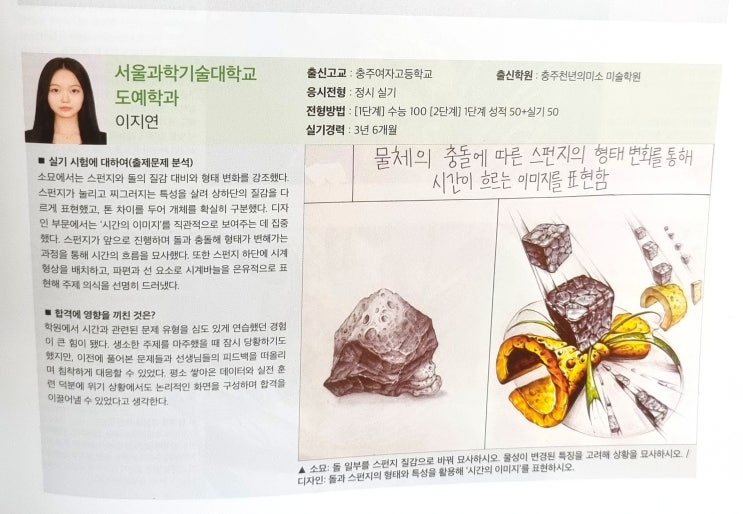 " 결과로 증명되는 충주 천년의미소 " 안녕하세요.^^ 어제 「월간 미대입시」 와 「아트앤디자인」 4월 호를 받아보았습니다. 매달 잡지를 펼칠 때마다 혹시 우리 학생들의 이름이 실려 있지는 않을까 하는 설렘으로 한 장 한 장 넘기게 되는데요, 충주 천년의미소 졸업생들의 이름을 발견할 때면 지금도 여전히 큰 기쁨과 보람을 느끼게 됩니다.^^ 먼저 「월간 미대입시」 4월 호에는 이번에 서울과학기술대학교에 합격한 이○연 학생의 합격 후기와 함께 우수한 합격 작품이 실려 있습니다. 또한 숙명여자대학교 7개년(2020~2026) 기출 분석 편에서는 2021년도와 22년도 기출문제에 우리 학생들의 합격 재현작이 수록되었습니다. 숙....... <img src="https://blogthumb.pstatic.net/MjAyNjA0MDJfMjQz/MDAxNzc1MTI5NzQ1NDc4.P5xPm_jeepMlqmyVLwbXIvwJDTIYX674B4ZxX-jNs1og.pC85yBDvs14RFI7y390Y5WMWNTHbp6YvppEt1kXWD8Ug.JPEG/%C3%E6%C1%D6%C3%B5%B3%E2%C0%C7%B9%CC%BC%D2_%C0%E2%C1%F6%BC%F6%B7%CF_4%BF%F9%C8%A3_%281%29.jpg?type=s3" />