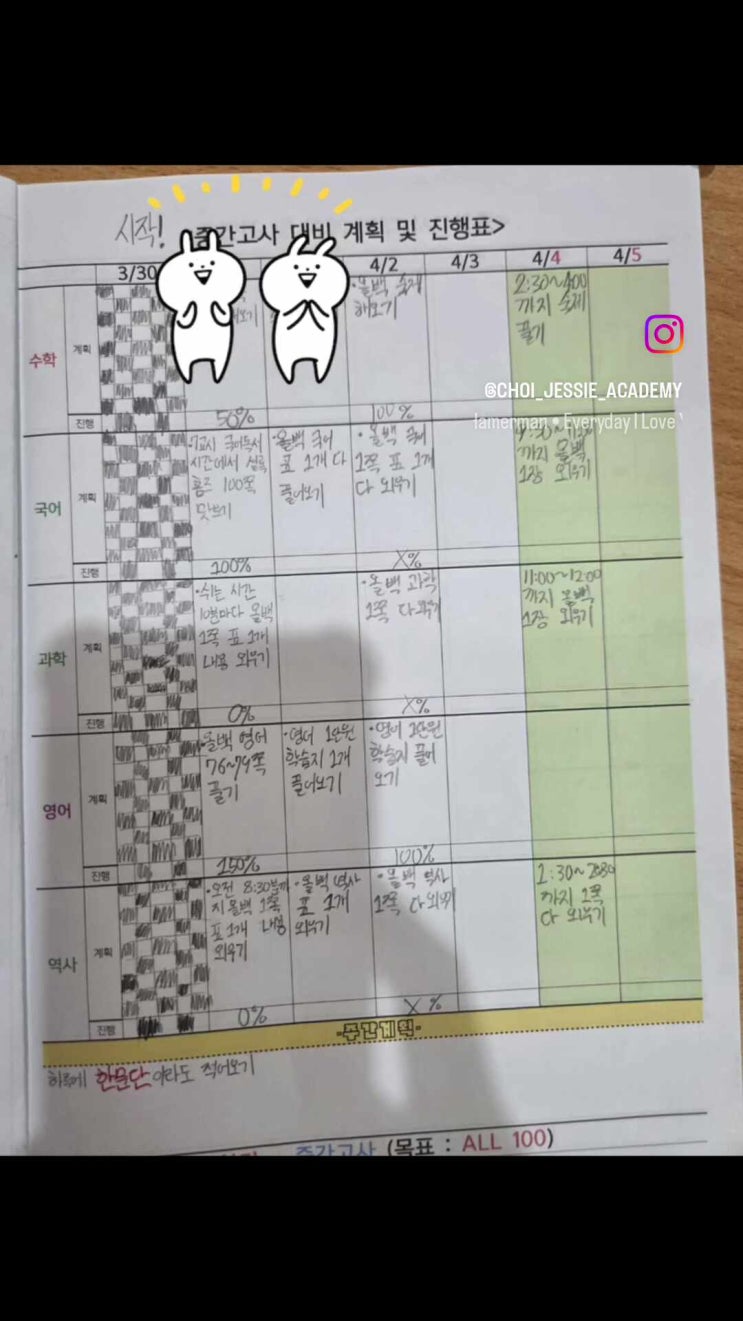 안녕하세요! 충주 목행동의 학습 등대, 최수학&제시영어학원입니다. 창밖에는 봄바람이 살랑이고 꽃봉오리가 터지는 눈부신 주말이지만, 우리 학원의 창가는 그보다 훨씬 더 뜨거운 열기로 가득 차 있습니다. 남들이 쉬어가는 이 시간에, 스스로 책상 앞에 앉아 미래를 설계하는 우리 아이들의 기특한 모습을 보고 있으면 가슴 한구석이 뭉클해지곤 합니다. 오늘은 이번 2026년 1학기 중간고사를 준비하며 '독기' 있게 몰입하고 있는 우리 아이들의 생생한 자습 현장과 그들의 진솔한 다짐들을 기록해보려 합니다. "귀차니즘을 이긴 1%의 의지" - 2026 중간고사 계획표 삐뚤빼뚤하지만 힘주어 눌러쓴 글씨체에....... <img src="https://phinf.pstatic.net/image.nmv/blog_2026_04_04_1607/0IJM0fJ0Q0_03.jpg?type=f480x480" />