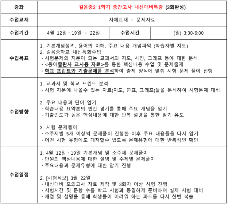 포인트원학원에서 우남주 선생님의 역사수업을 개설합니다. - 길음중2 중간고사 (3회완성) - 개강. 2026.4.12. 시간. (일) 오후 15:30-18:00 역사 과목은 학생이 조금만 신경쓰면 고득점이 나올 수 있는 과목입니다. 그러나 문제는, 우리 아이들이 공부를 잘 안합니다. 아무리 좋은 인강이 있어도 우리 아이들은 거들떠보지 않습니다. 시험 직전에서야 급하게 외우고 문제는 많이 풀어보지 않고 무작정 시험에 들어갑니다. 중학교 과정은 시험 점수도 중요하지만 공부방법을 가르쳐주는 것이 정말 필요합니다. 적어도 2주 전에 선생님와 주요 내용을 훑어보고 핵심적인 암기사항을 확인한다면 학교 시험에서 자신감을 가질 수 있을 것이라 생각합....... <img src="https://blogthumb.pstatic.net/MjAyNjA0MDZfMjg1/MDAxNzc1NDQ3OTM0Mjc2.NDWsciYOgdk3R8ky69WqFT9nb6EOOk3aGJCeWnNDn3Qg.uUrOTQDMVXgz0o-gSDP9ny4snOU7dLAYdoaYcFvtaTUg.PNG/%BD%BA%C5%A9%B8%B0%BC%A6_2026-04-06_%BF%C0%C8%C4_12.58.52.png?type=s3" />