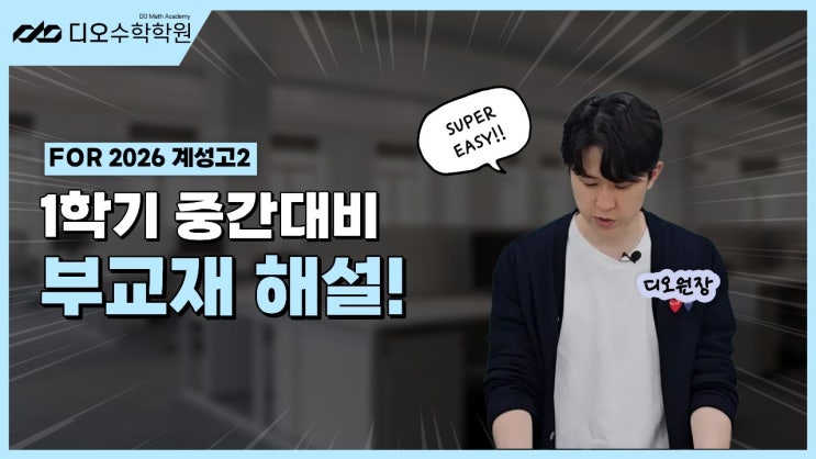 안녕하세요? 계성고등학교 수학전문 디오수학학원입니다. 이번 포스팅에서는 2026 계성고등학교 2학년 1학기 중간고사 대비 학교 부교재 해설강의를 준비했습니다. 이번 1학기 중간고사 범위는 대수 처음 ~ 삼각함수의 그래프로 과거와 달리 범위가 상당히 늘었습니다. 부교재 1은 총 20문항이며 문제은행 사이트에서 발췌 부교재 2는 총 24문항이며 최근 평가원 / 교육청 모의고사 기출로 이루어져있습니다. 썩 어려운 문제는 없으나 또 교과서 수준으로 쉬운 문제도 없습니다. 부교재에 수록된 모든 문항은 완벽한 숙지가 필요합니다. 이번 부교재 해설강의는 현강 영상으로 대체하겠습니다. <부교재1 : 1~10번> https://youtu.be/9QMQvp....... <img src="https://blogthumb.pstatic.net/MjAyNjA0MDdfMjAy/MDAxNzc1NTQ0NzIwMTIz.vAjdlKj9grEaX8SyDkqd_3qiBqRRv05po0HEV7a8_AQg.oFrTxO8bYRwCwffHn6UacO5Z7uooMBeyRxNoMccii94g.JPEG/%C1%A6%B8%F1%C0%BB_%C0%D4%B7%C2%C7%D8%C1%D6%BC%BC%BF%E4._%284%29.jpg?type=s3" />