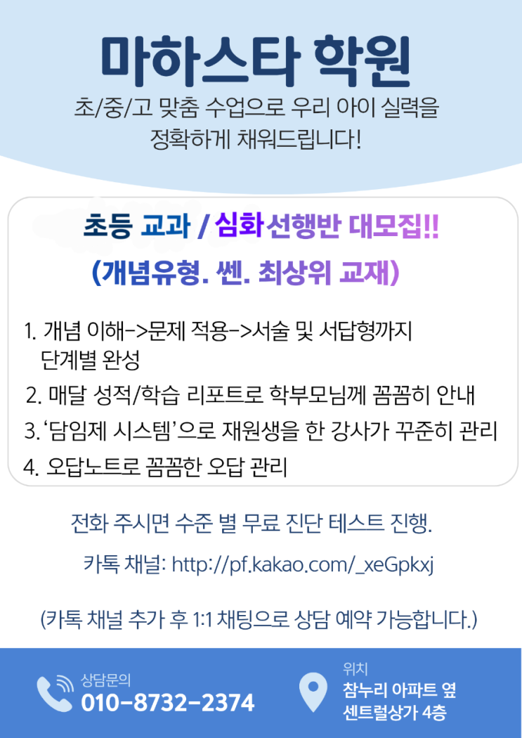 저희는 철저한 관리형 학원으로, 담임제를 통해 아이 한 명 한 명의 학습 상태를 꼼꼼히 챙기고 있습니다. 출결, 숙제, 진도, 이해도까지 세심하게 확인하며 학습이 흐트러지지 않도록 끝까지 책임감 있게 지도합니다. 또한 아이마다 다른 수준과 속도를 고려해 맞춤형 개별진도로 수업을 진행합니다. 잘하는 부분은 더 탄탄하게, 부족한 부분은 정확하게 보완하여 아이에게 꼭 필요한 학습이 이루어지도록 합니다. 단순히 문제를 많이 푸는 수업이 아니라, 아이의 현재 실력을 정확히 파악하고 목표까지 체계적으로 이끌어가는 수업을 약속드립니다. <img src="https://blogthumb.pstatic.net/MjAyNjA0MDdfMjEz/MDAxNzc1NTE2NTM0MTQ0.Y33u6WcX_rhU8w41X36vPIRFAv5NziRwlbu0-rsYf5Ug.u3YuoxlJ19y6wTESbwIBcUL7Ej9ZC5uVlA-MW63hlRIg.PNG/900%A3%DF%B1%CD%BF%A9%BF%EE_%BE%EE%B8%B0%C0%CC_%C0%CF%B7%AF%BD%BA%C6%AE_%BC%F6%C7%D0_%B0%F8%BA%CE%B9%E6_%C8%AB%BA%B8_%C0%FC%B4%DC%C1%F6%A3%DF20260307%A3%DF201948%A3%DF0000.png?type=s3" />