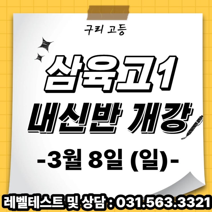 안녕하세요. 구리 심슨어학원 고등부입니다. 연일 계속되는 강추위로 자꾸만 몸을 움츠리게되는 요즘입니다. 모쪼록 감기 조심하시고, 구리 심슨어학원 고등부는 새로운 내신 시험을 준비하는 아이들을 위해 '삼육고1 내신대비반'을 개강합니다. 고등부 내신은 중등부 내신에 비해 시험 범위도 많고, 시험법위 안에서의 단순 지식뿐만 아니라 변형 문제와 서술형 문제등 본인이 가진 지식을 함께 할용해야 하는 '응용문제'의 비중이 높습니다. 고등부 내신을 어떻게 준비해야 할지 생소하고, 막막하다면 지금 바로 삼육고1 내신 대비반과 함께하세요~! 감사합니다. 개강일: 3월 8일 일요일 (주 1회반) <img src="https://blogthumb.pstatic.net/MjAyNjAxMjFfMjQy/MDAxNzY4OTc3MDc3NzQ4.QQSlNQEhlYK9Up8u1e1fxI5A64-Fkn41ZgSAP1zdBFAg.N6ZCBdJ9xhR6kLhdBIztqwMz5GlCYmeTQRfX1GUsOnwg.JPEG/%C1%A6%B8%F1%C0%BB_%C0%D4%B7%C2%C7%D8%C1%D6%BC%BC%BF%E4._%2859%29.jpg?type=s3" />