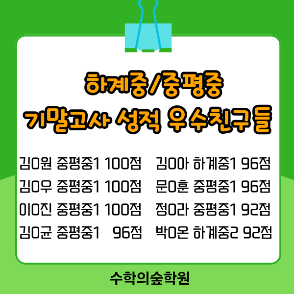 또 한 번, 결과로 증명했습니다. 2학기 기말고사 성적 우수자 발표 이번 12월에 치러진 2학기 기말고사는 이미 기말고사를 마친 중학교 3학년을 제외하고, 1·2학년 학생들만 응시한 시험이었습니다. 시험을 치른 학생 수는 이전보다 적었지만, 그만큼 학습 관리의 밀도는 더욱 높아졌고 그 결과는 숫자로 분명하게 증명되었습니다. 칼수학학원은 이번에도 ‘과정이 결과를 만든다’는 사실을 다시 한번 보여주었습니다. 2학기 기말고사 성과 한눈에 보기 (중등 1, 2학년) 이번 시험에서 칼수학학원 학생들이 기록한 성과는 다음과 같습니다. ㆍ성적 최우수 (100점) : 8명 ㆍ90점 이상 성적 우수 : 39명 ㆍ80점 이상 노력 우수 : 25명 ▶....... <img src="https://blogthumb.pstatic.net/MjAyNjAxMTFfMjM1/MDAxNzY4MTM2MzgyOTk3.eVlBrmoRpz6zRRryo85jdpw_jD0Jjj5snsTfU0Hw3IAg.fo5BKH0c5Bg6cndydEunMuAAsBDqQeoGmaa4gtwfYQcg.PNG/%C1%DF%B5%EE%BA%CE-%BC%BA%C0%FB%BF%EC%BC%F6%C0%DA-001.png?type=s3" />