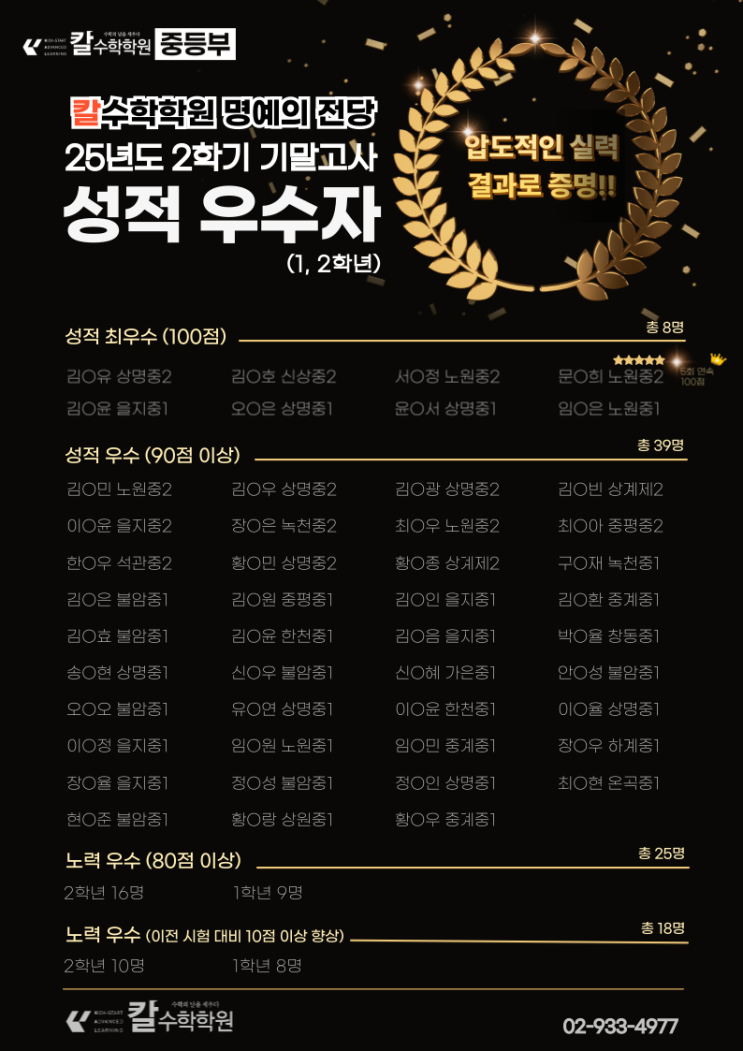 2학기 기말고사 성적 우수자 발표|또 한 번 결과로 증명한 칼수학학원 (중계동 수학학원)