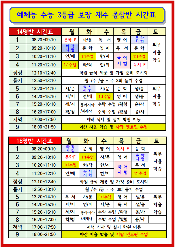 안녕하세요? 노원/강북 지역 유일의 예체능 재수학원 일대일 학원입니다. 우리 학원은 15년전 노원/강북 지역에서 최초로 예체능 학생들을 위한 맞춤 수업을 목적으로 개원 했습니다. 노원 유일 예체능 전문 수능 전문 일대일학원은 개원 4년동안 서울권 누적 합격생 1000명의 위대한 실적을 올리고 있습니다. 우리 학원의 놀라운 입시 실적은 14년간 예체능 수험생을 지도해온 전문화되고, 차별화된 예체능 전문 일대일학원만의 독특한 교육 커리큘럼 때문입니다. 예체능 수능 전문 일대일학원에서는 2027 학년도 수능대비 에체능 재수종합반을 모집중입니다. 우리 학원의 차별화된 고득점 교육 커리큘럼을 통해 수능 3등급 이상의 고득점을 필....... <img src="https://blogthumb.pstatic.net/MjAyNjAxMTJfMjEx/MDAxNzY4MTgzMzUyOTIw.ikVXrH_1N07Prn-bI5y0AlxMQPAG-aYBGM-AVZeuS88g.h0gTgOZbYqd27T9hx0Ge96Mx5dogbKzLbZgaUH1jH-Mg.PNG/2025-1.png?type=s3" />