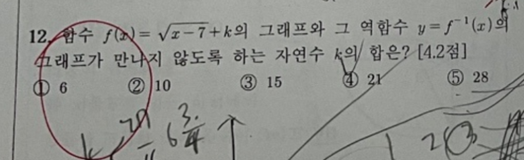 안녕하세요 TOMS 수학쌤 입니다 이번주에는 완산고 수학(상) 기출문제에 대해 분석하는 시간을 가지겠습니다. ㅡㅡㅡㅡㅡㅡㅡㅡㅡㅡㅡㅡㅡㅡㅡㅡㅡㅡㅡㅡㅡㅡㅡㅡㅡㅡㅡㅡㅡㅡㅡㅡㅡ <실제 시험 문제> 함수 f(x)의 그래프와 역함수가 만나지 않도록 하는 k 값을 구하는 문제입니다 증가하는 함수와 그 역함수는 y=x 위에서 만나므로 f(x)와 y=x의 관계를 보면 되겠죠? 먼저 y=x 와 y=f(x)가 만난다는 식을 작성하면 x = (x-7)^1/2 + k 가 됩니다 k를 이항해서 한쪽에 제곱근을 몰아놓은 후 양변을 제곱하면 x^2 - 2kx + k^2 = x-7 이 되고 좌변에 식을 몰아서 정리하면 x^2 -(2k + 1)x +k^2 + 7 = 0 이....... <img src="https://blogthumb.pstatic.net/MjAyNTEyMjFfMTEz/MDAxNzY2MzE4NzQxNDI3.6rkbQZchzjEWELSSQGt4UdTw7tryBON-7imD_hWJG-kg.5patSN3N1Im5SJkmE3sz6aQT-B1Ky7dBDmnqm1-9l48g.PNG/image.png?type=s3" />