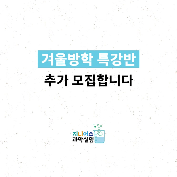 겨울방학 월요일 반, 화요일 반 특강 추가 모집 안내드립니다. 겨울방학 특강 추가 모집 저학년 반 1. 월요일 반 : 11시 10분 - 12시 10분 2. 화요일 반 : 11시 30분 - 12시 30분 각 반은 6명 정원으로 수업합니다. 현재 월요일 반은 2자리, 화요일 반은 3자리 남아 있습니다. 특강 추가모집 접수는 12월 31일 수요일에 마감합니다. 기존 모든 특강반은 현재 모두 마감된 상태입니다. 저의 20년 노하우가 담긴 <지니어스 과학학원>에 문의주세요. 교재와 실험 수업은 제가 직접 설계합니다. 관심이 있으신 분은 아래 번호 혹은 톡톡으로 연락주세요. *블로그 보고 연락 주셨다고 하시면 상담이 매끄럽습니다. ☎️ 063-224-2887 안녕하세요....... <img src="https://blogthumb.pstatic.net/MjAyNTEyMjNfMTA4/MDAxNzY2NDM4NjY3MDEx.Eu32vzWUNXn7lSbFsoLOWW6do60mGXJY3SV0SCnHT_Mg.dcmi91oKuKr8MkCsn8PP_0_IZf7duRMtLUUt_twQjPUg.JPEG/%BA%ED%B7%CE%B1%D7_%2822%29.jpg?type=s3" />