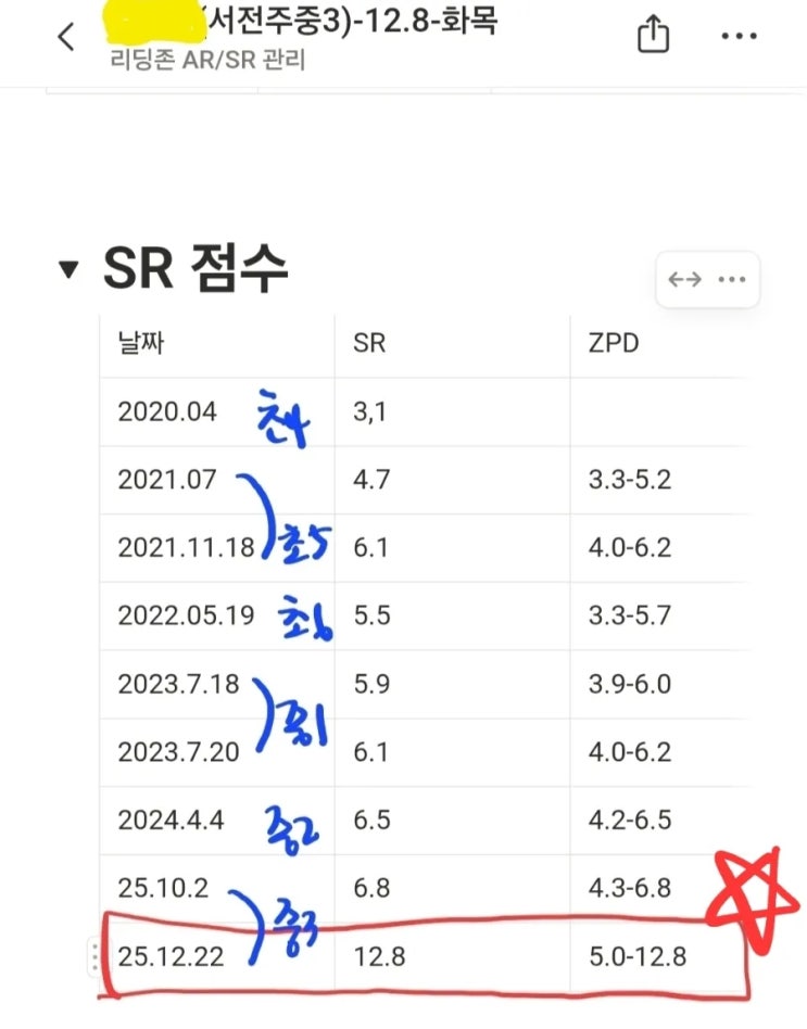 미국 초중고에서 사용하고있는 리딩레벨 진단 프로그램 Star Reading(SR) 만점은 12.9 이다. 어제 중3 아이가 12.9 만점에 12.8 이 나왔는데 마음이 많이 짠하고 기특했다. 2019년, 아이가 초3때부터 리딩존을 다녔는데 벌써 중3. 어려서부터 책을 참 좋아하는 아이여서 초3~초5까지는 읽는데로 성장하는듯 보였지만 (sr 점수상으론) 사실 중간에 아이의 슬럼프도 있었고 책읽고 글쓰고 하는 모든 것들이 어머니눈엔 느려보이셔서 걱정도 많이 하셨다. 그러나 제대로 꼼꼼하게 하는거여서 괜찮다고 익숙해지고 더 유창해지면 속도는 붙는다고 말씀드렸고 어머니께서는 나를 믿고 끝까지 보내주셨다. 다른 부분은 나를 잘 따르고 좋아하는 아이지....... <img src="https://blogthumb.pstatic.net/MjAyNTEyMjNfNTIg/MDAxNzY2NDQ2MzU4ODE3.pNJCoYqlopEq3INo_2pVskysetbp5aEcIdT1RkgGIvEg.-slypFzBX24hbc6Ux4-EPpouvI0tiTl8r97Ji-SRR-cg.JPEG/900%A3%DFScreenshot%A3%DF20251223%A3%DF072704%A3%DFGallery.jpg?type=s3" />