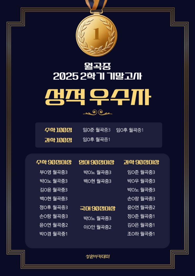 2025 성원아카데미 월곡중 2학기 기말고사 성적우수자