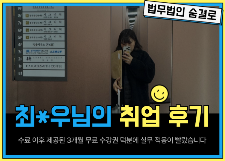 단순히 반복되는 사무 업무를 넘어, 전문 지식을 바탕으로 사람들에게 실질적인 도움과 기쁨을 줄 수 있는 직업을 찾아 법률사무원으로 성장중이신 최서우님의 취준생 탈출기를 들려드립니다. ● 이름 : 최서우 ● 기수 및 수강과목 : 89기 10월반 법률사무직원 취업교육과정(종합반), 91기 전자소송 및 회생파산 법률취업교육과정 ● 회사명 : 법무법인 숨결로 ● 직책 : 주임 ● 주요업무 : 송무업무 및 간단한 회계 ▶ 교육원을 다니게 된 계기는 무엇입니까? A : 고등학교 시절부터 대학 졸업까지 음악 전공자로서 한 기을 걸어오며 진로에 대해 깊이 고민했습니다. 단순히 반복되는 사무 업무를 넘어, 전문 지식을 바탕으로 사람들에게 실질....... <img src="https://blogthumb.pstatic.net/MjAyNjAyMDVfMjI1/MDAxNzcwMjc0NTQ4OTQz.E1zlOnEW2ywbh0Ac-qJBxVM9v-5oOFa1NGtoBdsNOTUg.52WQa47yStb1iXSnTT_ddEKoQ1vSfJLrOnsO7PEPBtwg.PNG/%C3%D6%BC%AD%BF%EC%B4%D4_%BD%E6%B3%D7%C0%CF.png?type=s3" />