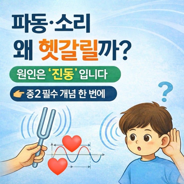 중학교 2학년 과학에서 많은 학생들이 헷갈려 하는 단원이 바로 ‘파동과 소리’입니다. 특히 진동, 진폭, 진동수 같은 개념을 구분하지 못해 그래프 문제에서 실수하는 경우가 많습니다. 이 글에서는 진동의 개념부터 파동과 소리까지 중2 눈높이로 쉽고 자세하게 정리해 보겠습니다. 중2 과학 3단원 파동과 소리는 모든 내용의 출발점이 바로 **‘진동’**입니다. 진동을 제대로 이해하지 못하면 파동, 소리의 세기, 높낮이 개념까지 모두 헷갈릴 수밖에 없습니다. 따라서 이 단원은 진동 → 파동 → 소리 순서로 이해하는 것이 가장 중요합니다. 1️⃣ 진동이란 무엇인가? (모든 개념의 출발점) 진동이란 물체가 일정한 기준 위치를 중심으로....... <img src="https://blogthumb.pstatic.net/MjAyNjAyMDVfNTAg/MDAxNzcwMjQ0MTE3Mjk1.GFPXMgT5KLNzi4aXM_-yM3JHl4mQ5H0XlkTwY5RydMog.T3aQ2-nvy8ImBQX0xBuH21tvehtcaiDCD4_JuhibtTsg.JPEG/output%A3%DF3971573451.jpg?type=s3" />