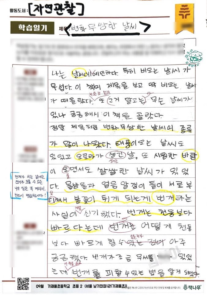 안녕하세요. 책나무 남가좌점 1관입니다. 책나무 남가좌점 선생님들이 뽑은 이달의 글쓰기왕 선발 결과를 알려드립니다! 글쓰기왕이란? 꾸준히 문해력을 갈고닦은 책나무 남가좌점 아이들의 글쓰기 실력으로 빚어진 결과물 중, 가장 훌륭한 독후활동을 선발하는 책나무 남가좌점만의 특별한 대회입니다. 매달 저학년(1~3학년) 2명, 고학년(4~6학년) 2명을 선발하여 아이들의 독서 활동을 더욱 고무시켜줍니다. 그럼 2025년 12월의 글쓰기왕 주인공들은 과연 누구일지 확인해볼까요? 글쓰기왕 :: 저학년 부문 - 가재울초 2학년 김*아 - 가재울초 3학년 조*건 2학년 김*아 학생은 자연관찰 영역의 날씨의 변화에 대한 과학 도서를 읽고 자신의 경험....... <img src="https://blogthumb.pstatic.net/MjAyNTEyMzFfMTk0/MDAxNzY3MTU4NzA2MTM2.sJWJN4WYP0GKPh7mtXrxnCQBNqVn3FIqgXf87IwH6UIg.Q--xKJhTUZ8WzrFcLfWS5CSW2NaBX6tiIQQI8SJXXRgg.JPEG/KakaoTalk_20251231_132625508.jpg?type=s3" />