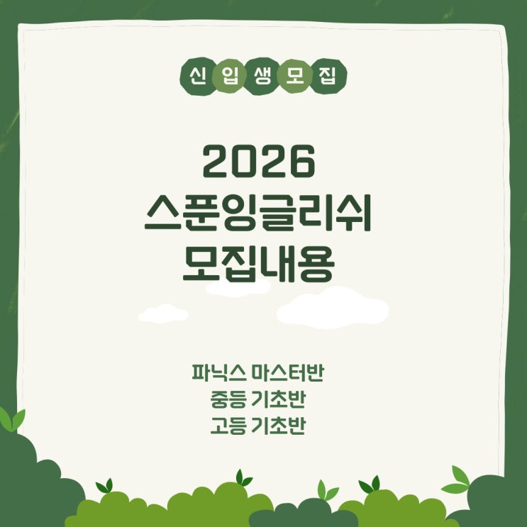 안녕하세요! 아이들의 진정한 성장을 함께 꿈꾸며 돕는 스푼 잉글리쉬입니다 함께 오래 한 친구들을 보면 성장기라 그런지 정말 많이 달라져 있네요. 성장하는 아이들의 마음 속에 따뜻한 말을 심어주고 흔들림 없는 자신감을 가득 채워줄 수 있는 교육이 되길 늘 소망합니다. 곧 맞이할 2026년에도 함께할 새로운 친구들을 기다립니다! 초등 고급과정이나 중고등 학년반도 수업중이지만 간절한 학생들을 위해 3가지 반을 중심으로 특별모집합니다. 1. 학생의 장단점과 상관없이 주어진 커리큘럼만 속도를 내다보면 어느 순간 구멍이 생길 수 밖에 없어요. 소그룹 수업 안에서 부족한 부분을 꼼꼼하게 진단받으며 다양한 영역을 재밌고 다채롭게....... <img src="https://blogthumb.pstatic.net/MjAyNTEyMTdfMTUg/MDAxNzY1OTYyNDY3ODM1.vOIEm5jH7xiSiR_B8W3-mYWMDBgEV1hOEAdCnrfXhEYg.6h5eB6IIERfdjkVKD0kaqIb-pBPICei1shbZysF2MHMg.JPEG/001.jpg?type=s3" />