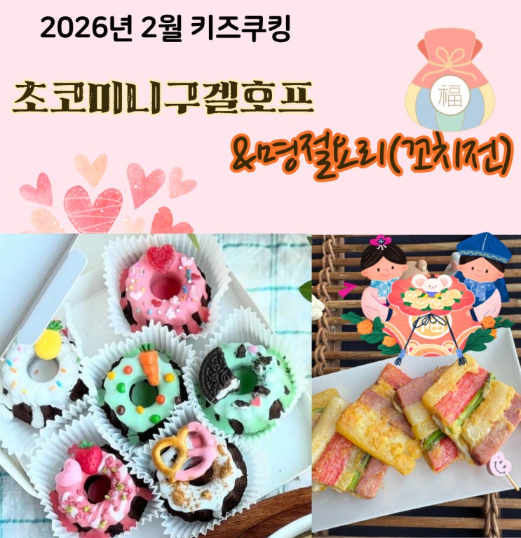 26년 2월은 설날과 발렌타인데이가 있는 달이네요. 그래서 나우쿠킹에서는 설날요리인 꼬치전과 발렌타인 데이를 위한 초코맛 미니구겔호프 만들기를 준비했어요 명절요리중 아이들이 좋아하는 메뉴중 하나인 꼬치전인데요 마트나 시장에서 요즘은 많이 사먹고, 할머니댁에 가야 먹을수 있는 그런 명절음식인데요 아이들과 함께 나우쿠킹에서 만들어 보면 어떠세요? 아이들이 좋아하는 재료인 떡까지 넣어서 만들어 보았어요. 꼬치전에 떡은 꽂지 않는데, 생각보다 너무 맛있답니다. 설명절에는 떡국도 먹잖아요. ㅎ 크기에 맞추어 자른후 꼬치에 꽂아서 만드는 전인데 가지런하고, 색도 예뻐서 아이들과 만들기 어렵지 않은 명절음식입니다. 가....... <img src="https://blogthumb.pstatic.net/MjAyNjAyMDFfMTg5/MDAxNzY5OTIwMjk4NDQ3.Kbl7vtjDN8U4MhlEM85k08G8A6AbrH3UI83jvPWuOcsg.mCn8VGRyeIY-xmAvpIA__HsLD73fhzHb0r2ZgGlfyPcg.JPEG/%C1%A6%B8%F1%C0%BB-%C0%D4%B7%C2%C7%D8%C1%D6%BC%BC%BF%E4_-001_%287%29.jpg?type=s3" />