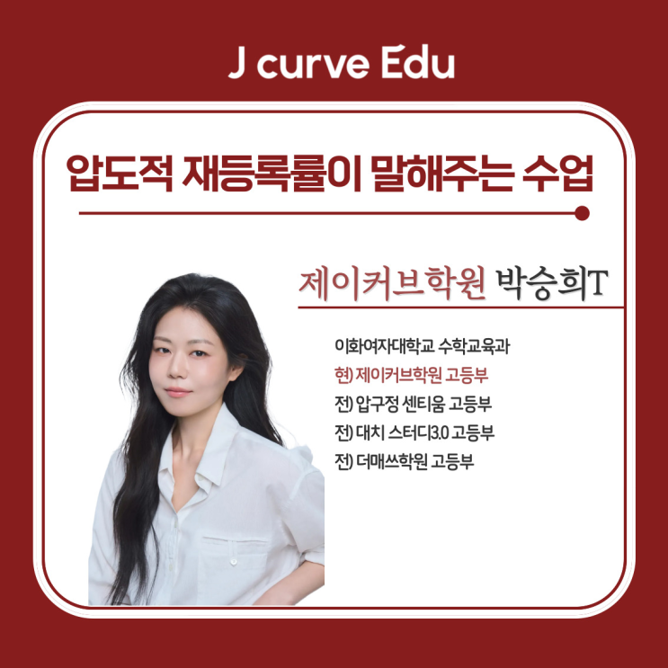 안녕하세요 서대문구 종로구 초중고 수학전문 제이커브학원입니다. 오늘은 제이커브학원에서 이대부고·이화여고 전담반을 맡아서 지도하시면서 대표강사로서 연합반까지 맡고 운영하고 계시는 박승희 선생님을 소개드리려고 합니다. 점수보다 성적보다 먼저 바꿔야 하는 것은 따로 있다. 박승희 선생님께서는 점수보다 먼저 문제를 대하는 태도와 시험 볼 때의 판단력 이 두 가지를 변화시키는 수업을 중요하게 생각하시는 분입니다. 왜냐하면 성적은 위에서 언급한 두 가지가 충족되면 자연스럽게 따라오는 결과라고 믿고 있기 때문입니다. 그래서 학생을 지도하시기 저에 스스로에게 질문을 던지신다고 해요. "이것이 정말 학생들에게 도....... <img src="https://blogthumb.pstatic.net/MjAyNjAyMDNfMjUy/MDAxNzcwMDgzMjYwOTg5.-P54llFUPiU_l6Q4XkGPY07pmKAhGUXfMSuP89w7H8kg.gW2-u-c_3GOV5a065f_K2dqN6LJcGiVs92Kc0DTHDqcg.PNG/image.png?type=s3" />