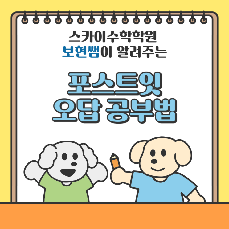 안녕하세요 스카이수학학원 보현쌤입니다. 오늘은 포스트잇을 활용한 수학 공부법에 대해 말씀드리겠습니다. 수학을 공부하다보면 오답이 생길수밖에 없죠 그 오답을 어떻게 잘 고치느냐에 따라 성적이 바뀐다고해도 과언이 아닌데요 오늘은 저희 학원에서 실제로 시행하고 있는 포스트잇 오답정리법에 대해서 설명드려보려고 합니다. 오답정리법은 간단합니다. 오답이 생기면 보현쌤과 같이 고친뒤 완전히 이해가 되었을 경우 스스로 오답에 대한 해설을 적으면서 정리하는 과정입니다. 오답에 대한 해설을 스스로 적는 과정에서 틀린 원인과 실수한 부분을 깨닫게 되고 고치는 과정에서 문제에 대한 파악이 됩니다. 그러면 다음번에 비슷한 문....... <img src="https://blogthumb.pstatic.net/MjAyNjAyMDRfMTQz/MDAxNzcwMTczNTIyMDY5.hYE3aFdanvA94Is7ohQDIFvi-gcYua4emcCQMhpns1Mg.tQbUKGX5XZhQLnu9icGcvu4X9UYKH0eXNgRecUfRAC8g.PNG/001.png?type=s3" />
