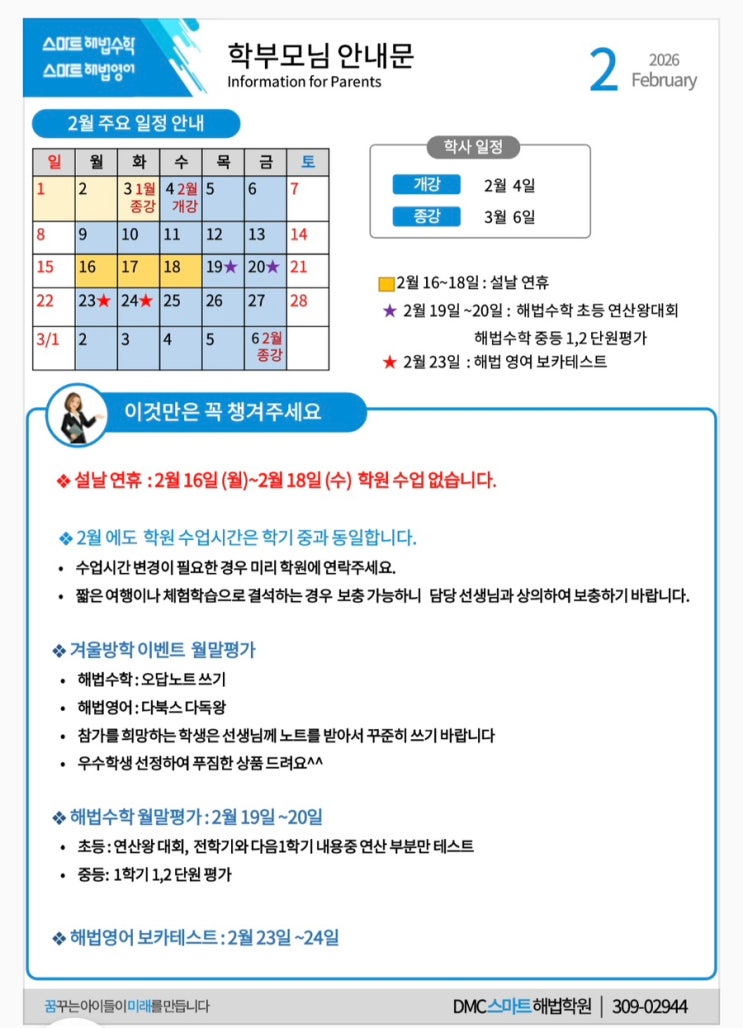DMC스마트해법학원/ 남가좌동 2월 학부모 안내문