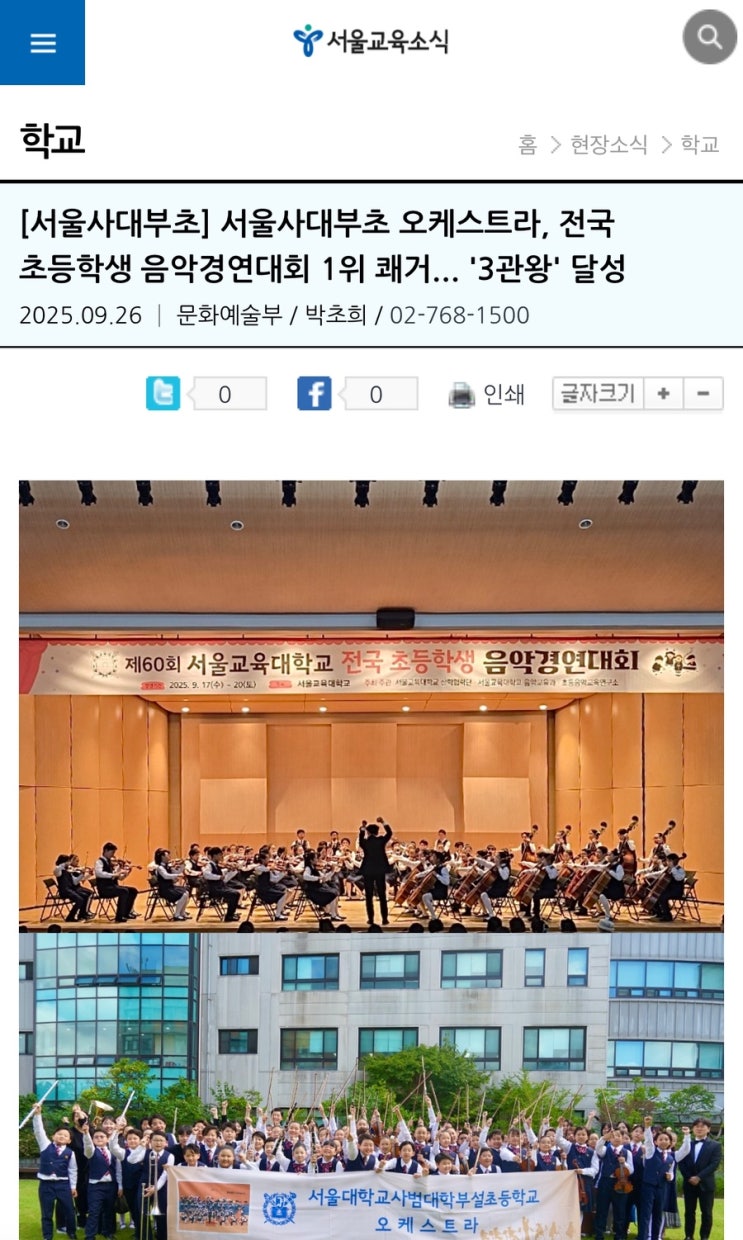 서울대학교 사범대학 부속 초등학교 서울사대부초 오케스트라 서울사대부초 오케스트라가 올해 전국 초등학생 음악경연대회에서 1위를 차지했습니다 서울대학교사범대학부설초등학교(이하 서울사대부초) 오케스트라가 제60회 전국 초등학생 음악경연대회에서 오케스트라 부문 1위, 지도교사상, 지휘자상을 동시에 수상하며 3관왕의 영예를 안았다. 이번 대회는 2025년 9월 20일(토) 서울교육대학교 주최로 열렸으며, 전국 내로라하는 13개 초등학교 오케스트라가 참가해 기량을 겨뤘다. 서울사대부초 오케스트라는 F.v. Suppe의 「Isabella Overture」를 연주하며 무대 위에서 단원들과 지휘자가 하나 되어 호흡을 맞췄고, 관객과 심사위원들....... <img src="https://blogthumb.pstatic.net/MjAyNTExMjdfOTQg/MDAxNzY0MTY5MzYxMDgw.l881eLyV6AWhVeHdha_e8V7M8kUdfhAR5ZoX2mG58Cwg.ajsN0tH3Z3OQzw8TUHQ8kx4oDXV6XiLThtiFqHWn8hsg.JPEG/IMG%A3%DF9653.jpg?type=s3" />