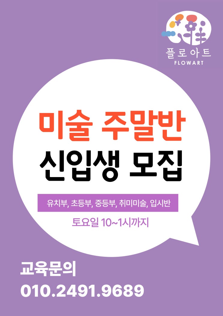 안녕하세요! 미술로 자신감과 자존감을 키우는 행복한 몰입, 마포구 소의초, 청파초, 봉래초 정문에 위치한 플로아트미술학원 열정 원장쌤입니다. "미술학원 보내고 싶은데, 평일에는 시간이 너무 빠듯해요" "주말에 의미 있게 보낼 수 있는 곳이 없을까요?" 주말 수업 문의주시는 학부모님들께서 많았는데요~ 그래서 플로아트미술학원에서 드디어 토요일 주말반을 개강했습니다! 주말반 안내 운영 요일: 매주 토요일 수업 시간: 오전 9시 30분- 오후 1시 수업 대상: 유치부~초등부 전학년, 중고등 회화반, 입시반 바쁜 평일, 학교와 여러 일정을 소화하다 보면 아이가 온전히 자신만의 시간을....... <img src="https://blogthumb.pstatic.net/MjAyNjA0MDFfMjgz/MDAxNzc1MDI0MjIyNDY4.woMai2ggZSXG_h5jIwhHA4RMA_Jrfx6LDC05HNxtYHQg.5DKL1z7oxRgWnnNW2m4Mani33yMT-zKfVdrSq6WuUUYg.JPEG/%C1%A6%B8%F1%C0%BB-%C0%D4%B7%C2%C7%D8%C1%D6%BC%BC%BF%E4_-002.jpg?type=s3" />
