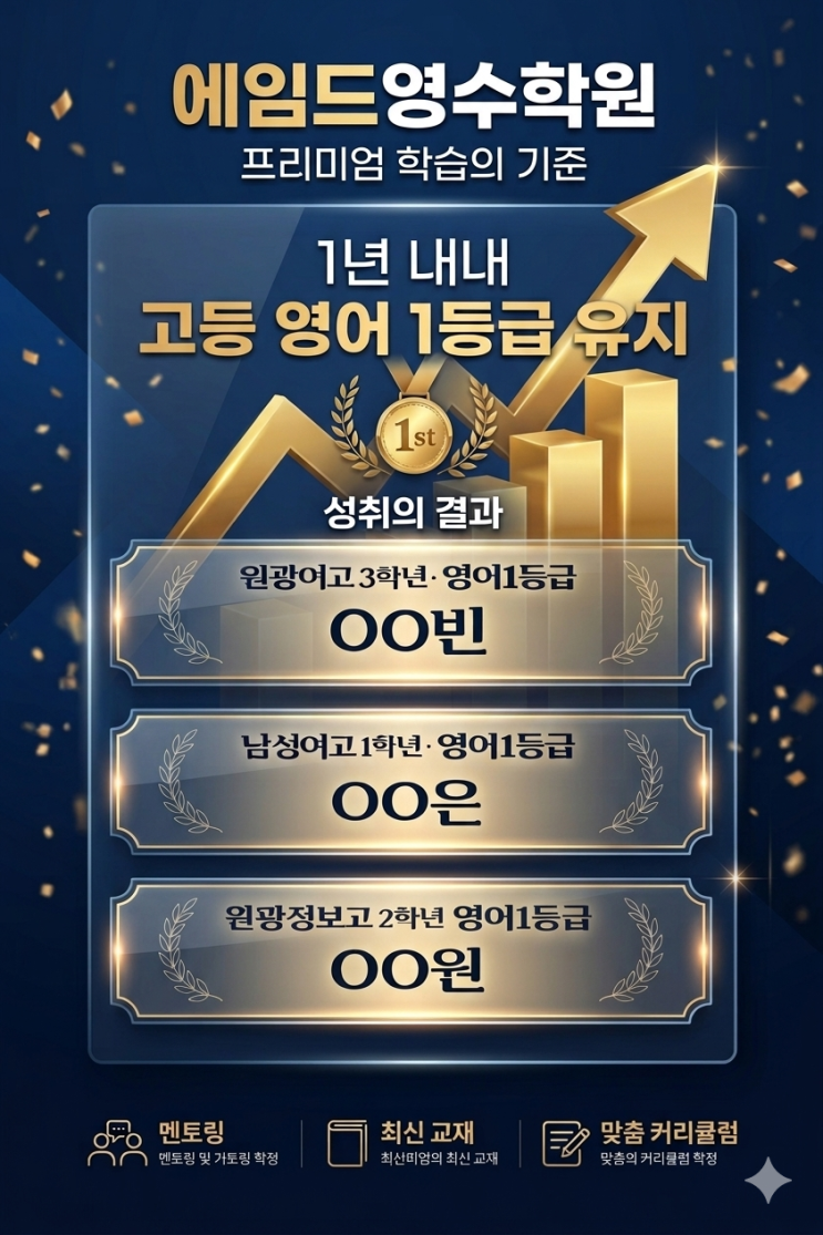 안녕하세요 에임드영수학원입니다. 저희 학원은 ‘프리미엄 학습의 기준’이라는 목표 아래 단순한 성적 향상이 아닌 꾸준한 성취와 유지에 집중하고 있습니다. 이번에 소개드릴 성과는 단순한 단기 결과가 아닌, 1년 내내 고등 영어 1등급을 유지한 실제 사례입니다. 학생 개개인의 학습 습관과 이해도를 기반으로 체계적인 관리와 맞춤형 커리큘럼을 운영한 결과입니다. 원광여고 3학년, 남성여고 1학년, 원광정보고 2학년 학생 모두 영어 1등급을 안정적으로 유지하며 성취를 이어가고 있습니다. 에임드영수학원은 개별 맞춤 멘토링 최신 트렌드를 반영한 교재 학생별 수준에 최적화된 커리큘럼 을 통해 결과를 만들어냅니다. 성적은 단기간에....... <img src="https://blogthumb.pstatic.net/MjAyNjA0MDFfMTMy/MDAxNzc1MDMwOTU0Mjkx.XgLMTZwoDOZfxuX4VGcCkGN-pzkxou-od2NdlV81_lcg.osPnZlQfqQjkihTBRzXpKij06UlPcvsg8dryzXzs-gAg.PNG/image.png?type=s3" />