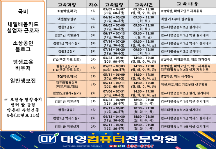 익산컴퓨터 모현동 대영컴퓨터전문학원 교육생 모집 안녕하세요! 새로운 시작을 준비하고 계신가요? 진로 전환, 취업 준비, 또는 자기계발을 위한 국비지원 교육과정을 찾고 계시다면, 국비지원 교육! 지금 바로 시작하세요 – 모현동에서 가까운 교육기관 안내 이곳에서는 내일배움카드를 활용한 다양한 교육 과정이 운영 중이며, 실업자, 재직자, 소상공인 모두 수강이 가능합니다. 또한 평생교육 바우처를 통해 일반생도 지원받을 수 있어, 학습의 기회를 놓치지 마세요! 수강신청 방법 내일배움카드 소지자는 고용24 사이트 또는 방문 신청 소상공인·일반인은 평생교육 바우처 이용 가능 좌석 제한 있어 선착순 마감! 위치 모....... <img src="https://blogthumb.pstatic.net/MjAyNjA0MDJfMTQy/MDAxNzc1MDkyOTQ3NzAx.Be8qiEX9TsUZaQnrFBJuemGLZpNmTOE7joWJmbgJhl0g.sPQBgExqQtVyGsA5Ej7Rssln9rWmGcRkn9Cgc3Pb8qAg.PNG/0413.png?type=s3" />