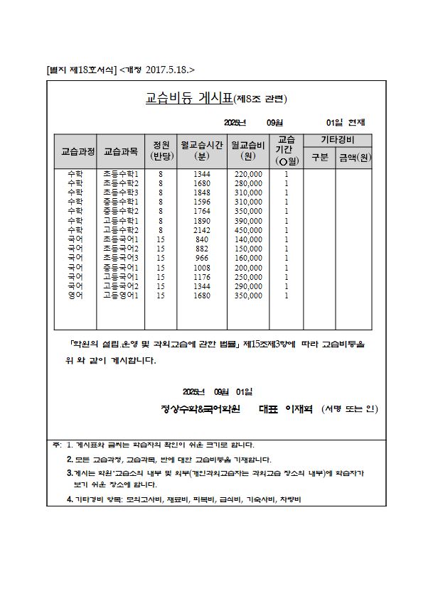 정상어학원 중랑분원, 정상 수학&국어 교습비(2025년 9월 기준)