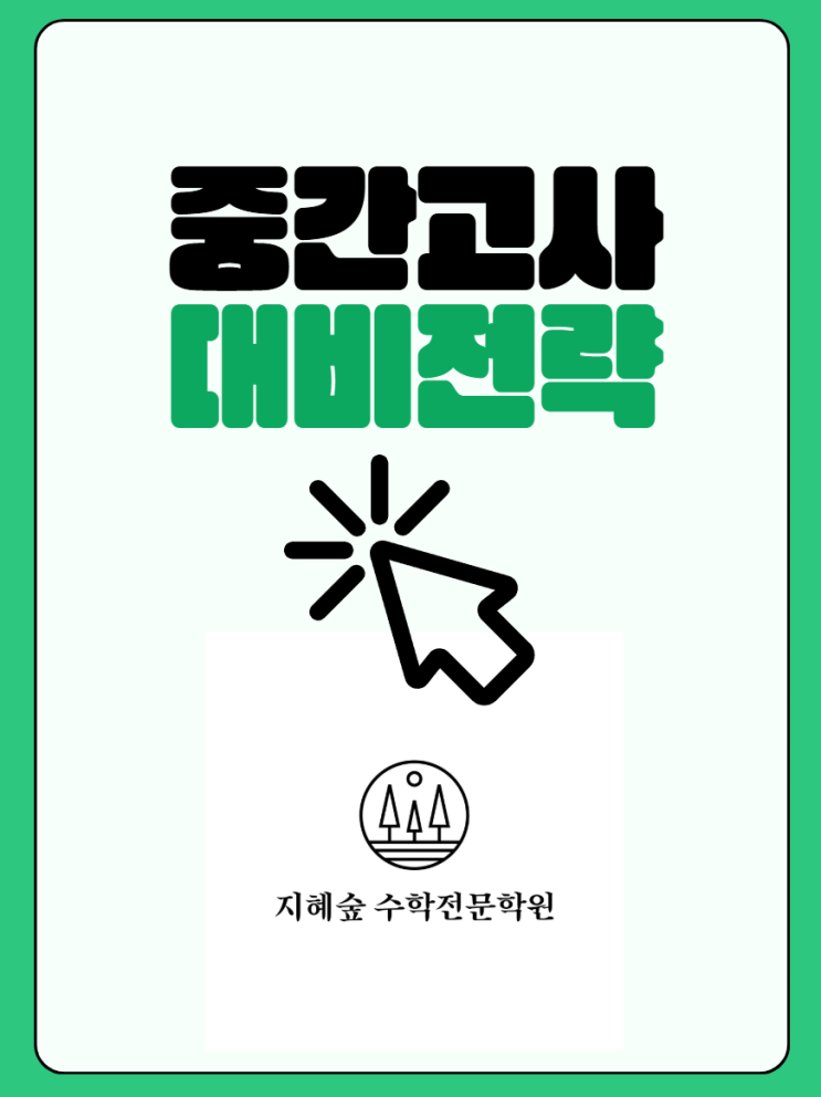 안녕하세요 지혜숲 수학학원입니다! 중간고사가 약 한 달 앞으로 다가온 지금, 학생들과 학부모님들 모두 긴장감과 조급함이 교차하는 시기입니다. 이 중요한 골든타임을 어떻게 활용하느냐에 따라 내신 등급의 앞자리가 바뀔 수 있습니다. 지혜숲 수학학원에서 제안하는 중간고사 필승 전략과, 우리 아이들의 실수를 실력으로 바꿔줄 특별한 학습 서비스를 소개합니다. 중간고사 D-30, 왜 '교과서'와 '부교재'인가? 많은 학생이 시험이 다가오면 불안한 마음에 새로운 문제집이나 어려운 심화 교재에 손을 댑니다. 하지만 내신 시험의 본질을 잊어서는 안 됩니다. 출제 위원은 학교 선생님이고 출제 근거는 교과서와 학교에....... <img src="https://blogthumb.pstatic.net/MjAyNjAzMjdfMTEz/MDAxNzc0NTgxNTYxNjA0.IOvn3XVUdhVYh6ZLO9sBl1n6aY0ufJqD0c_BzxH0IZkg.W1OCmT2JUZ9--JsSOSJCTeCAzPg7qfp1VgxUQ4gGnBQg.PNG/image.png?type=s3" />