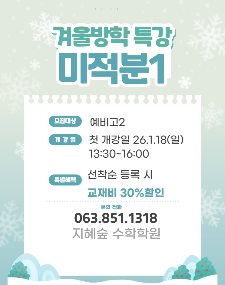 안녕하세요 지혜숲 수학학원입니다. 최근 저희 학원에 많은 관심을 주시고 실제로 많은 분들이 등록해 주셨습니다. 정말 감사드립니다. 이제 대수 강의를 마무리하고 미적분 1 수업 개강 안내를 진행하려고 합니다. 미적분 1 수업은 주말 수업만 진행하고 평일은 시간표가 꽉 차서 진행하지 않습니다. 관심 있으신 분들은 학원으로 문의하시면 친절하게 상담 진행하겠습니다. 혹여나 전화가 부담스러우시면 네이버 톡 톡으로도 비대면 상담 진행 가능하니 많은 관심 부탁드립니다! 미적분 1 수업 진행과정 미적분 1 수업은 주말에만 진행하고 첫 개강 일은 26.1.18(일)입니다. 수업 시간은 13:30~16:00 2시간 30분 수업으로 진행합니다. 특별혜택....... <img src="https://blogthumb.pstatic.net/MjAyNjAxMTFfNzIg/MDAxNzY4MTMwMjU5NzQ2.MjJWDZlcv8QX9ANxV3n22SiuCuxCo2E6wWppkzMVl28g.H3YYrl6TAs7h1hhjfJw1yURYOP2OcDvBVD9NjFDxwHQg.PNG/image.png?type=s3" />