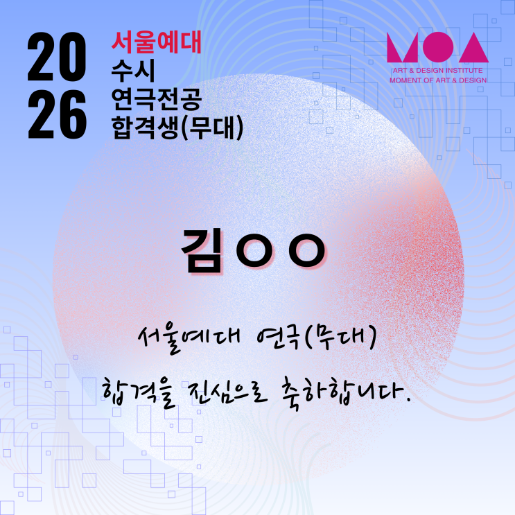 2026학년도 서울예대 수시 연극전공(무대) 합격생 ※합격을 축하합니다!※ ✨합격을 위한 체계적인 준비!✨ 전문적인 지도와 함께 당신의 예술적 가능성을 확장 하세요! 상담 문의 : 02 - 322 - 4979 / 010 - 2392 - 7680 카카오채널, 인스타DM, 블로그 상담실 문의 가능 <img src="https://blogthumb.pstatic.net/MjAyNTEyMTlfMTI3/MDAxNzY2MTE2ODE0Nzgz.5HmNlhxsPfEgU_0D42eje7L-VPeLnZ9w7goeZXylpJ4g.wUqJwHvWHyHP37SBVIGHiNMyGiIg7GjdOdHQ51WdZfgg.PNG/%BC%AD%BF%EF%BF%B9%B4%EB1.png?type=s3" />