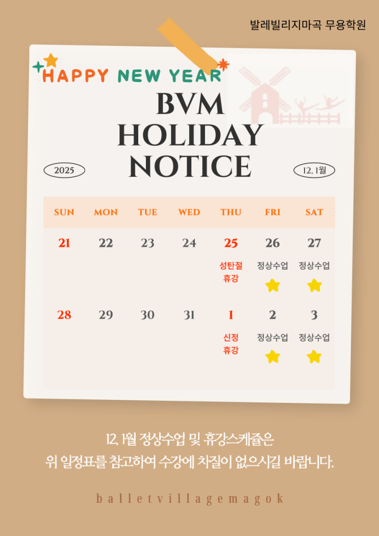 [방화동무용학원] 2025 성탄절 & 2026 신정 휴강일정 확인하세요ㅣ발레빌리지마곡ㅣ마곡나루발레학원 강서구유아댄스 마곡역성인발레 마곡엠밸리발레 신방화초등발레 방화동취미발레
