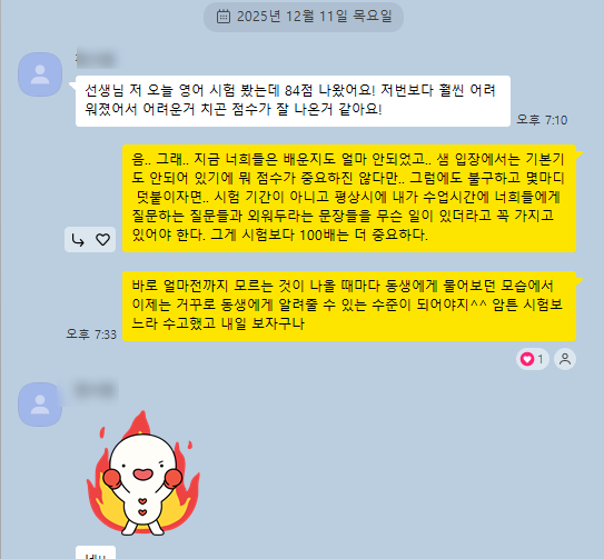 시험이 끝난 날, 명덕여중 한 학생에게서 메시지가 하나 왔습니다.(25년 12월 11일) “선생님 저 오늘 영어 시험 봤는데 84점 나왔어요! 저번보다 훨씬 어려워졌는데, 어려운 거 치곤 점수가 잘 나온 것 같아요.” 점수만 보면 84점일 수 있습니다. 하지만 이 점수의 의미는 숫자보다 훨씬 큽니다. 이 학생은 제가 만난 지 불과 4개월밖에 되지 않은 아이이고, 처음 왔을 당시에는 모르는 게 나오면 중학교 1학년 동생에게 질문하던 수준이었기 때문입니다. 이 학생은 예전에 다니던 학원에서 시험 대비를 위해 한 달 이상 지문을 외우고 문제를 풀었지만 결과는 60점이었습니다. 이유는 단순했습니다. 그리고 지난 중간고사 직후, 이 학생이 제....... <img src="https://blogthumb.pstatic.net/MjAyNTEyMTNfMjA3/MDAxNzY1NjM3MDkwNzMw.sS0T3S0LhIDPKi0ng57lc6vs3vS33QfKqxp9H7vvSScg.q498zEZurqPzX4ZYdw_GSg5StGPlUDGInN0_2Ol7m5gg.PNG/image.png?type=s3" />
