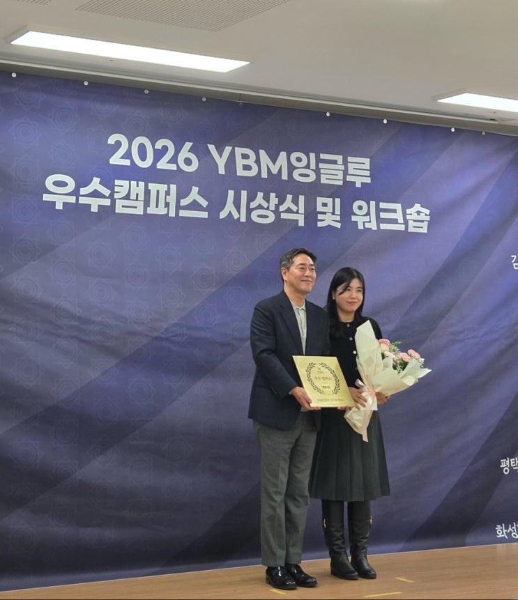 #초등영어#중등영어#YBM잉글루신도림제1캠퍼스#신도림영어#신도림영어학원#YBM잉글루신도림#자기주도학습#파닉스#잉글루#영어#english#YBM#engloo#ybmengloo YBM 잉글루 우수캠퍼스 선정, 12번의 감사한 기록 얼마 전, YBM 잉글루 우수캠퍼스로 선정되어 연수원에서 뜻깊은 상을 받고 돌아왔습니다. YBM 본사 사업본부 이정철 상무님과 한컷 ^^ 2011년 개원 하여 열심히 운영하면서 처음 이 상을 받았던 해가 2013년이었는데, 올해까지 무려 12년 연속으로 우수캠퍼스로 선정되었다는 사실이 아직도 믿기지 않고, 무엇보다 감사한 마음이 큽니다. 이 상은 혼자만의 노력으로 받을 수 있는 상이 아니라 함께해주신 원장님/선생님들, 그리고 무....... <img src="https://blogthumb.pstatic.net/MjAyNjAxMjFfMTgg/MDAxNzY4OTYwNzQzMDkw.FFusFW8V34Rz2wE1g3YT8CNXURbOjNhdWpfnBGxyBxMg.z54oIUaP8MejKsxpByhqRiDrVsLvasGXZZlm5k0cKdUg.JPEG/IMG%A3%DF0216.jpg?type=s3" />