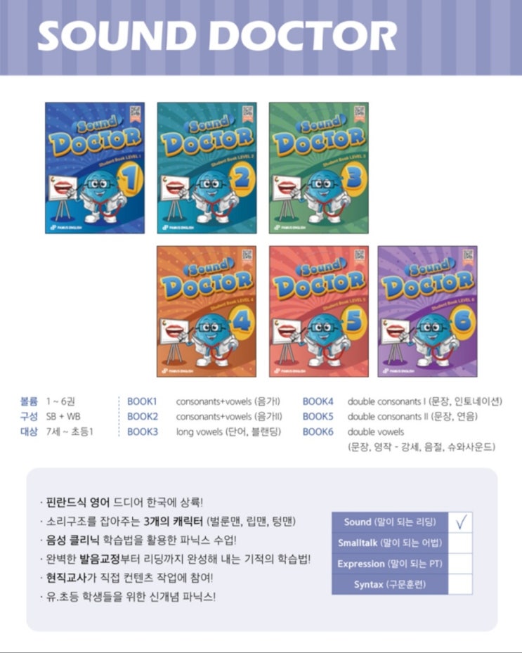 ■교재소개 완벽한 발음 교정부터 리딩을 위한 탄탄한 기초를 쌓을 수 있는 파닉스교재 사운드닥터 아이들의 영어학습 시작을 파머스 영어와 해야하는 이유가 있습니다. 바로 핀란드식 파닉스 교육 사운드 닥터 교재인데요! 사운드 닥터 교재라인은 핀란드식 영어 교육법을 탑재한 시중에서는 결코 찾아볼 수 없는 특별한 교재입니다! 사운드 닥터의 가장 큰 특징은 우리말의 발성방법과는 전~혀 다른 영어소리를 내는 방법을 입술모양과 혀의 위치까지 꼼꼼하게 잡아주도록 설계되었기에 EFL환경 속 영어를 처음 접하는 우리 아이들이 영어발음을 모국어에 가깝게 습득하게 하는 음성클리닉 과정이라는 점입니다! 핀란드식 파닉스 교육 소리치료....... <img src="https://blogthumb.pstatic.net/MjAyNjAyMDJfMjcy/MDAxNzcwMDEzMDcwODEz.y3J4JAsoy7nmtuBrf4gmHkTiJMSmPTnXrww0vsJVyX4g.b7BSjGOOnG-lVZOVFSCCY1dD_bHDlDOyBpiG9LkgR8Ug.JPEG/Screenshot%A3%DF20230810%A3%DF022607%A3%DFKakaoTalk.jpg?type=s3" />