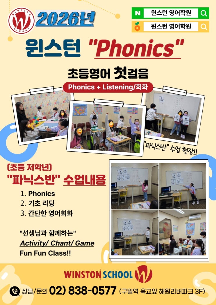 안녕하세요, [윈스턴 영어학원]입니다^^ 2026년 3월부터 새로운 "파닉스 반"이 신설됩니다. (2월 말까지 신청) 신규 파닉스반 친구들은 Level-Test 가 없습니다~ (바로 수업 가능) "윈스턴 파닉스반"은 단순한 모니터/헤드폰 활용이 아닌, 선생님과 함께 Activity, Chant, Game 등을 하는 활동적인 수업 입니다. 파닉스반 주요 수업 내용은: [파닉스+기초 리딩+기초 영어회화]입니다. 새로운 파닉스반 친구들~~♥♥ 3월에 만나요^^ [윈스턴 영어학원 위치 안내] (구일역 1번 출구 도보 2~3분) ☎02) 838-0577 <img src="https://blogthumb.pstatic.net/MjAyNjAyMDNfMjYx/MDAxNzcwMDk4NTk2NzQ4.TY3IO_je8g7RFZ6E0DtdyDjfLU7ELYQicdzNYihFVwUg.ll8NB46gKAn40SPXpsftcHRu96xrJ9P9OCTYfWkMIc4g.JPEG/54737760_1765420382216.jpg?type=s3" />