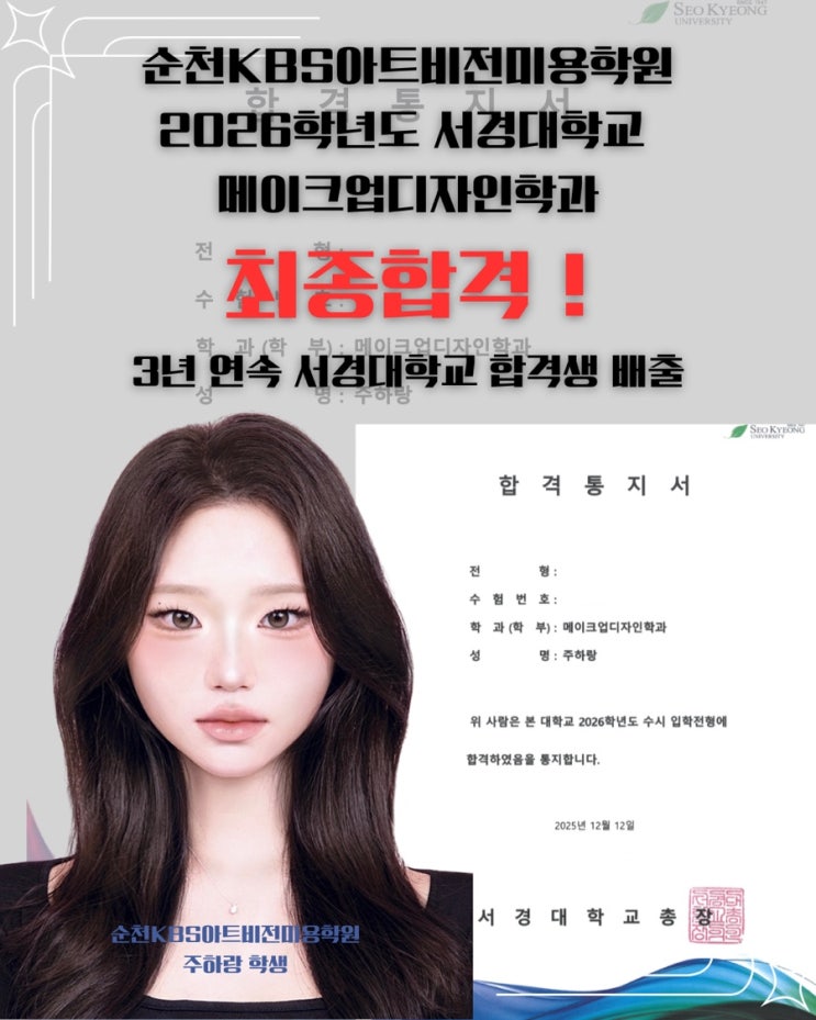 안녕하세요 오늘은 기분 좋은 소식 전해드려요 순천 KBS아트비전미용학원에서 준비한 주하랑 학생이 2026학년도 서경대학교 메이크업디자인학과 수시 전형 최종합격이라는 정말 멋진 결과를 만들어냈습니다! 꾸준하게 포트폴리오 준비부터 전형에 맞춘 실기 연습까지 차근차근 준비해온 결과라 더 의미 있었던 합격이에요 ✨ 기본기부터 표현력, 완성도까지 꼼꼼하게 다져온 시간이 이번 결과로 제대로 증명된 것 같아요 특히 이번 합격으로 3년 연속 서경대학교 합격생 배출이라는 기록도 함께 이어가게 되었어요 학생 한 명, 한 명의 진로에 맞춰 준비하는 수업이 결과로 이어지고 있어 더 뿌듯한 순간입니다. 다시 한 번 주하....... <img src="https://blogthumb.pstatic.net/MjAyNTEyMTlfNTAg/MDAxNzY2MTQyNTM5NTA4.8KANWbjZ-BZwjw48SGrSx_wDC26PRahB3H4RjnAT6VQg.OmThssIjq0zYNdhhbosqZUy9v3SNuqZHteroc-BBbFIg.JPEG/IMG%A3%DF7313.jpg?type=s3" />