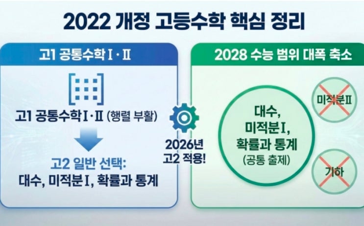 .2022 개정교육과정을 적용 받는 학생들 현중3부터 고1이 치르게 될 2028년 대입수능에 중대한 변화가 있습니다. 고등내신(괴, 각 4점) 기존 : 수학(상), 수학(하) 에서 변경 : 수학(1), 수학(2) 로 일반 선택 과목(고2~고3) 기존 : 수학(1), 수학(2), 확률과 통계 에서 변경 : 대수, 미적분1, 확률과 통계로 진로선택과목 기존 : 미적분, 기하 에서 변경 : 미적분2, 기하, 경제수학, 인공수학, 직무수학으 로 융합선택(신설) 수학과 문학, 실용통계, 수학과제탐구 2028 수능출제 범위 대수, 미적분1, 확률과통계(공통출제) 미적분2와 기하는 제외되며 문이과 구분없이 같은 문제로 수능을 치르게 됩니다. 딱풀리는수학은 교육개정에 빠르게 대처....... <img src="https://blogthumb.pstatic.net/MjAyNjAyMDFfMTgw/MDAxNzY5OTQ0OTczMTAw.e_4P5NHvmF-MziZ6Ba-xUDCOsbiqQpFcWGcyBC6d7GIg.0VD5sGL2HWK82UBsrT1L7Vca2EMDb30H91G1YtBorncg.JPEG/Screenshot%A3%DF20260201%A3%DF194358%A3%DFNAVER.jpg?type=s3" />