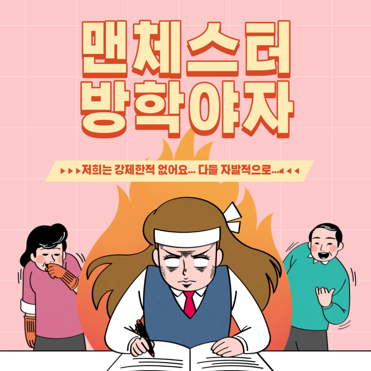 안녕하세요. 맨체스터 학원 원장 김두환입니다. 맨체스터 학원은 방학 기간 동안 7시부터 10시까지 야간 자율학습을 운영하고 있습니다. 주로 참여하는 학생들은 예비 고1부터 예비 고3까지이며, 중학생도 신청을 받아 함께 참여하고 있습니다. 특히 자신의 목표와 진로가 비교적 분명한 학생들이 자율학습을 많이 활용하고 있습니다. 요즘 많은 학생들이 “집에서는 공부가 잘 안 된다”고 이야기합니다. 사실 가정에서 조용한 분위기를 유지하며 공부하는 것이 쉽지 않은 것이 현실입니다. 이러한 이유로 맨체스터 학원은 방학 중에도 학생들이 안정적인 환경에서 자기주도적으로 공부할 수 있도록 자습 시간을 운영하고 있습니다. 자습 시간에....... <img src="https://blogthumb.pstatic.net/MjAyNjAxMTZfMTc1/MDAxNzY4NTQ3ODYzNTc3.u9MV-aRwJ99tQ5SQfXMt7KDf_8xyil_QurhaVRSJkWAg.FqJoUM8jymfismo36y3KSRrApY3wuWxkgREq1TMtQoYg.PNG/%C1%A6%B8%F1%C0%BB_%C0%D4%B7%C2%C7%D8%C1%D6%BC%BC%BF%E4..png?type=s3" />
