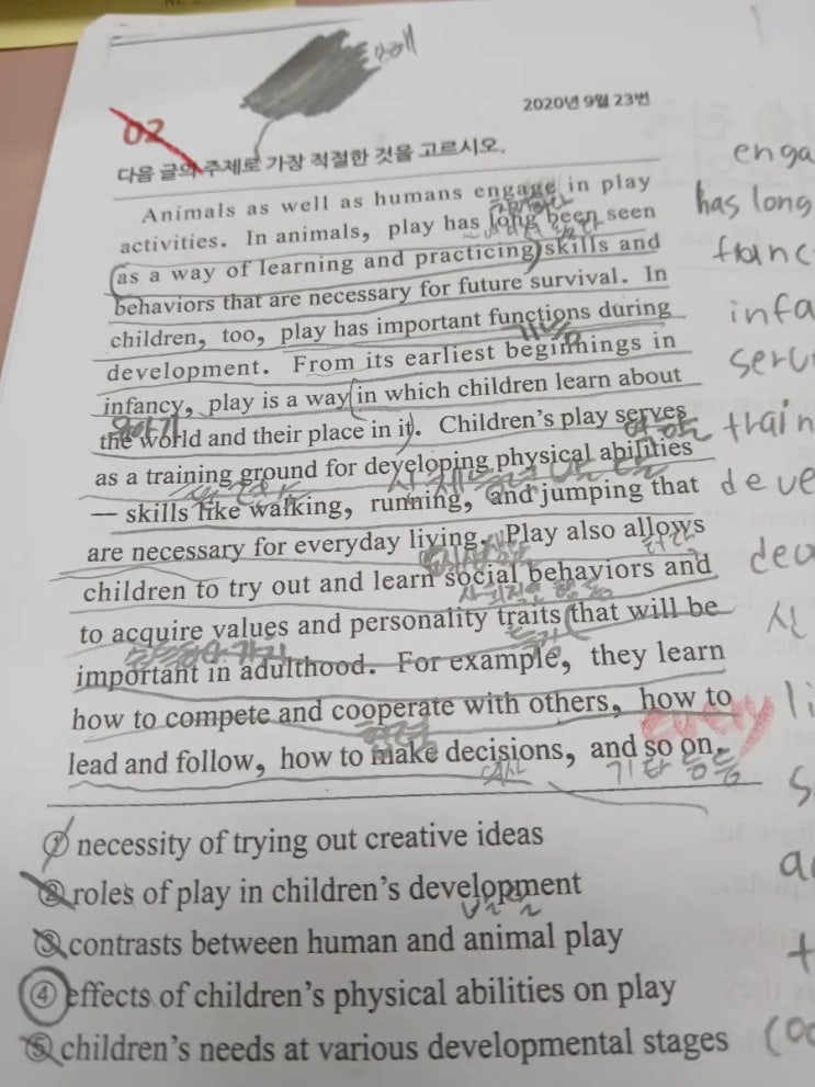 개별 수업을 하다 보면 아이들마다 받아들이는 역량이 다르다. 주어진 시간에 같은 단원을 배우는 것도 좋지만 받아들이는 그릇이 큰 아이들은 좀 더 어려운 과정들을 학습시킨다. 그중 하나가 우리 초5,6학년 몇 명에게는 고등 모의고사 문제를 풀린다. 이해도 못 해서 학습에 전혀 도움도 되지 않는 그러한 문제는 풀리지 않는다. 아이들이 쉽게 접근할 수 있는 문제로 풀린다. 부담 갖지 않게. 그러나 자신감 가질 수 있는 문제를 풀린다. 이 문제를 푸는 5,6학년 친구들은 단어도 상당히 높은 레벨을 하고 있고 항상 과제들을 잘해오고 수업태도도 좋은 특징이 있다. 수능시험에서 외국어 영역인 영어시험은 70분간 총 45문항의 시험을 치른....... <img src="https://blogthumb.pstatic.net/MjAyNTEyMTVfMTQx/MDAxNzY1ODAzMzcyNTgw.mt6aLxrifHCHaFs0mlxdV9YK9EZuz8dqPIYzT49Amo8g.87lLNQttrUyWAGNfMlJycNYFc1dm5taXcwJAcQmcCpgg.JPEG/900%A3%DF20250822%A3%DF183050.jpg?type=s3" />