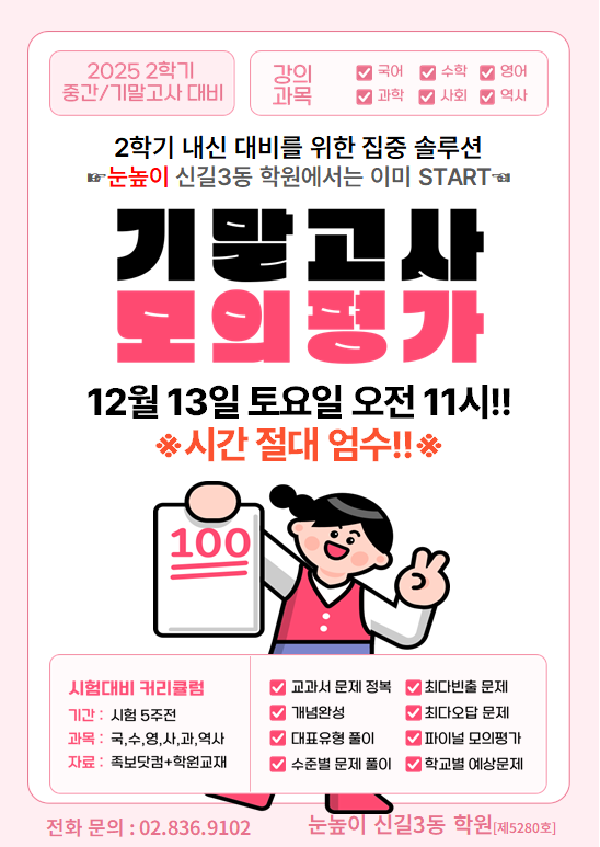 기말고사가 가까워질수록 아이들의 하루는 조용해지고, 책상 앞에 앉아 있는 시간은 더 길어집니다. 눈높이 신길3동학원은 이번 중등 기말고사를 앞두고 시험 전 마지막 정리를 위한 ‘기말고사 대비반’과 ‘파이널 모의평가’를 집중 운영하고 있습니다. #중등기말고사대비 #신길동중등학원 ■실전처럼, 더 진지하게 파이널 모의평가로 점수를 준비합니다. 말이 없어도 느껴집니다. 시험이 가까워질수록 깊어지는 집중의 공기. 눈높이 신길3동학원의 파이널 모의평가는 학교 시험 유형을 반영한 실전 문제 실제 시험과 동일한 시간·환경 시험 직후 이어지는 오답 점검과 개별 피드백으로 ‘아는 문제를 실수 없이 풀어내는 힘’을 기르는 과정....... <img src="https://blogthumb.pstatic.net/MjAyNTEyMTdfMjg0/MDAxNzY1OTU5MzU0MTU0.nYBeUGVhOEGTv87xRe9ZythtaFAUOdL8T8aV_lpsh5Ag.TuMYQnIelU5p3QgnXCxhxCc4UNj0pXpXyP_Wsv48VoYg.PNG/%C8%AD%B8%E9_%C4%B8%C3%B3_2025-12-17_171532.png?type=s3" />