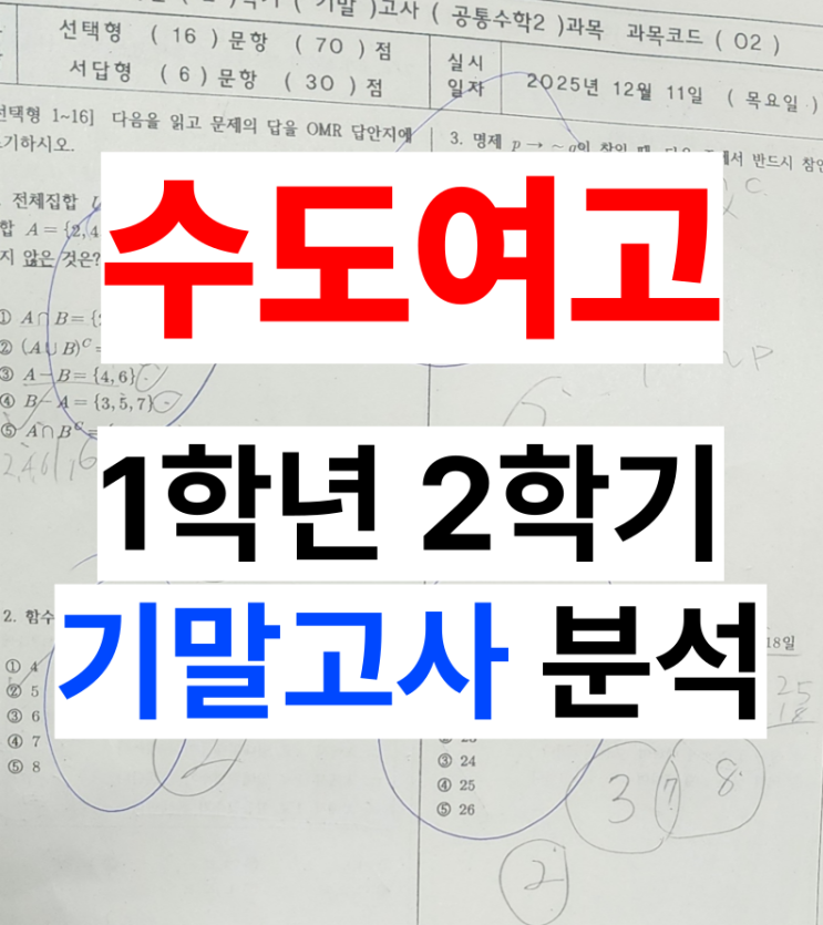 안녕하세요. 김정은수학 꿀벌군단 입니다. 오늘은 수도여자고등학교 수도여고 1학년 2학기 기말고사 분석입니다. 작년 기출보다 어려워졌다는게 느껴지는 시험이었는데요. 전체적인 시험의 구성이 어땠는지 자세하게 살펴보도록 하겠습니다. 총평 25년도 수도여자고등학교 1학년 2학기 기말고사는 중상 으로 평가합니다. 작년 기출과 비교하여 난이도가 소폭 상승하였고, 서답형 문항수가 3문항에서 6문항으로 늘어나고, 배점비중이 증가하였습니다. 선택형 2문항이 줄었지만, 체감 시간 압박은 훨씬 심했을겁니다. 특히 서답형 후반부에 산술,기하 평균의 최대,최소나 도형의 넓이 활용 등 풀이 과정이 길고 복잡한 문제들이 배치되어 많은 학생....... <img src="https://blogthumb.pstatic.net/MjAyNTEyMThfMjU0/MDAxNzY2MDM3ODA1MTA1.BoJZVbZf6e_GUS5BOS40CuRF5-ZiBZ5xdFO59gE_OE4g.fwNhShDOSfFOeUjKbyx2o8AXnAq_2Kz0qTJMj5Fk69Eg.PNG/006.png?type=s3" />