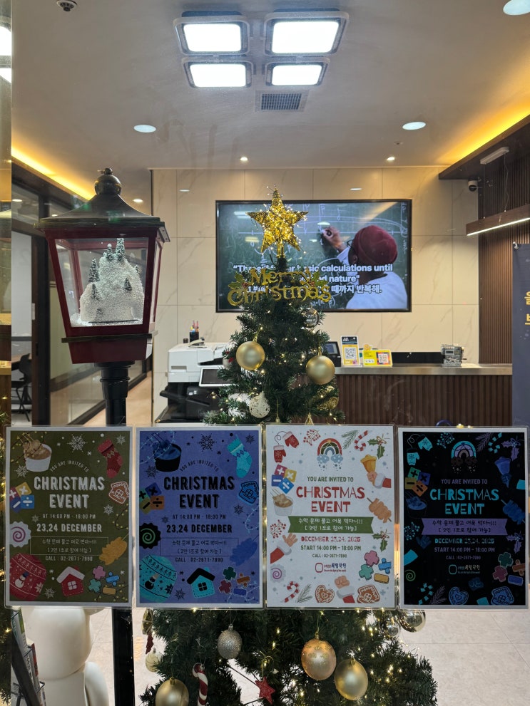 연말 분위기 가득한 크리스마스 수학 이벤트 소식 전해드릴게요~~~♬ 1수학 문제 풀고 1어묵 먹자 다가오는 크리스마스를 맞아 공부도 하고 따뜻한 간식도 챙길 수 있는 소소하지만 즐거운 이벤트를 준비했습니다. 수학 문제 1문제만 풀면 어묵 쿠폰 1장이 바로 지급돼요! [참여 방법] 2인 1조로 참여 (재원생은 물론 외부 학생도 참여 가능합니다) [진행 일정] 12월 23일(화), 24일(수) 초등부 클리닉 시간인 오후 2시 ~ 6시 친구와 함께하면 재미도 두 배! 협동심도 쑥쑥~ 부담 없이 들러서 수학 문제도 풀고 따뜻한 어묵으로 연말 분위기까지 느껴보세요. 크리스마스 시즌, 공부가 조금 더 즐거워지는 시간! 많은 관심과 참여 부탁드립니다♥....... <img src="https://blogthumb.pstatic.net/MjAyNTEyMThfMjU4/MDAxNzY2MDQyODg0NTM0.6RXWH2gJydIKgxMnAMYxWwVpgW9-AdU1Z5Yg-BEe3oQg.iCiWduaK5rL30M-9Hh3Y-hdoWMPa0gCDA_PZRJm5yi8g.JPEG/KakaoTalk_20251218_145026628_01.jpg?type=s3" />